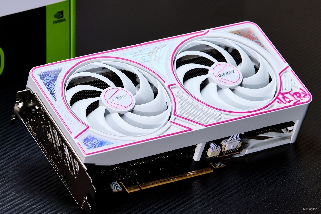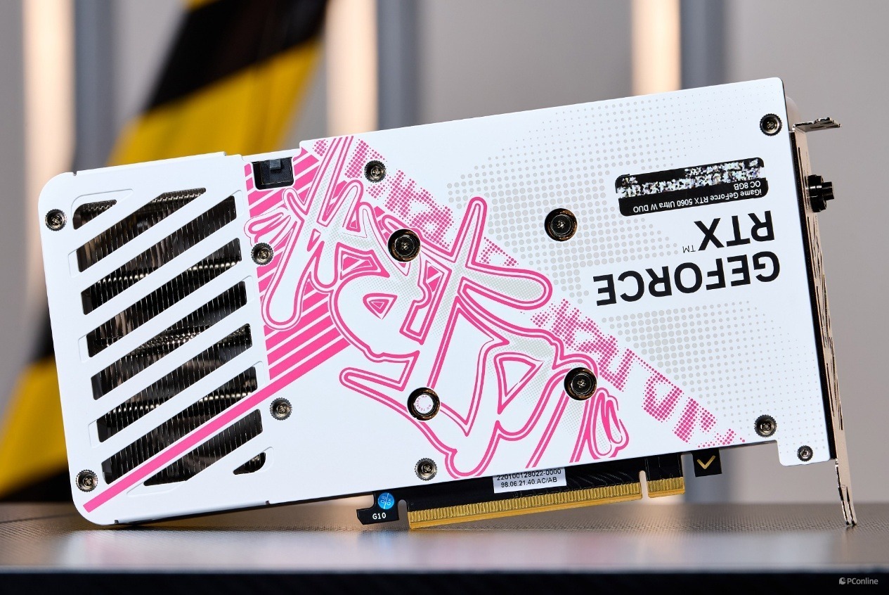 iGame GeForce RTX 5060 Ultra W DUO OC 8GB显卡在外观设计上可谓独树一帜,采用了“嘻哈艺术”风格的设计语言。白色的基础底色搭配鲜艳桃红色调的涂鸦式艺术字“Ultra”样纹饰,充满了青春活力与潮流气息。这种设计不仅符合当下年轻玩家对个性化的追求,而且与iGame Ultra家族系列产品的风格相得益彰,无论是单独装机还是打造全家桶式的主机配置,都能展现出出色的整体美感。