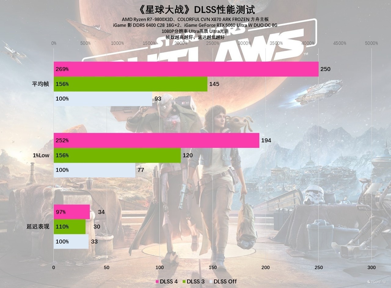 实测DLSS 4在这类优化欠佳的游戏中确实大有用处,在1080P原生分辨率下,iGame GeForce RTX 5060 Ultra W DUO OC 8GB的平均帧仅有77 FPS,整体游玩体验还不错。而开启DLSS 4质量档以后,游戏平均帧直接暴增至250 FPS,游戏体验如德芙般丝滑,对比原生1080P的表现,足足有2.7倍左右的提升。即便是对比DLSS 3的145 FPS,也是足足提升了100+ FPS。