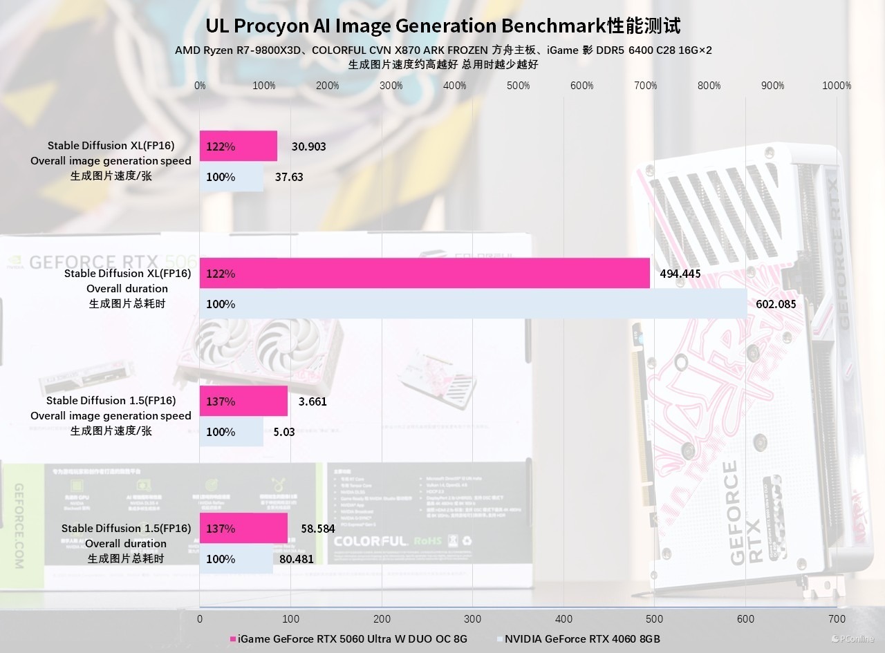 接着我们再看看iGame GeForce RTX 5060 Ultra W DUO OC 8GB在Stable Diffusion中FP16下的表现如何,还是用UL Procyon进行测试,在比较轻松的SD 1.5文生图测试里,iGame GeForce RTX 5060 Ultra W DUO OC 8GB的表现非常优秀,生成一张图的速度仅需3.66秒,效率比上代显卡快了37%。而即便是在压力比较大的SDXL中,优势也非常明显,生成一张图的速度为30.9秒,同样领先RTX 4060约22%。