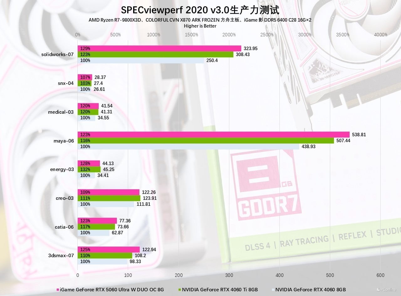 工业领域我们用的是SPEC2020进行测试,它能够反应显卡的整体工业能力,在多项测试中iGame GeForce RTX 5060 Ultra W DUO OC 8GB对比RTX 4060平均有20%的提升,部分项目领先幅度更高,而对比RTX 4060 Ti,两者也是互有胜负。