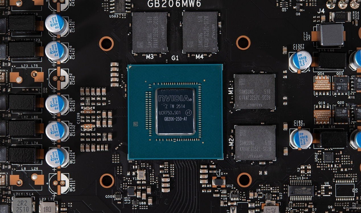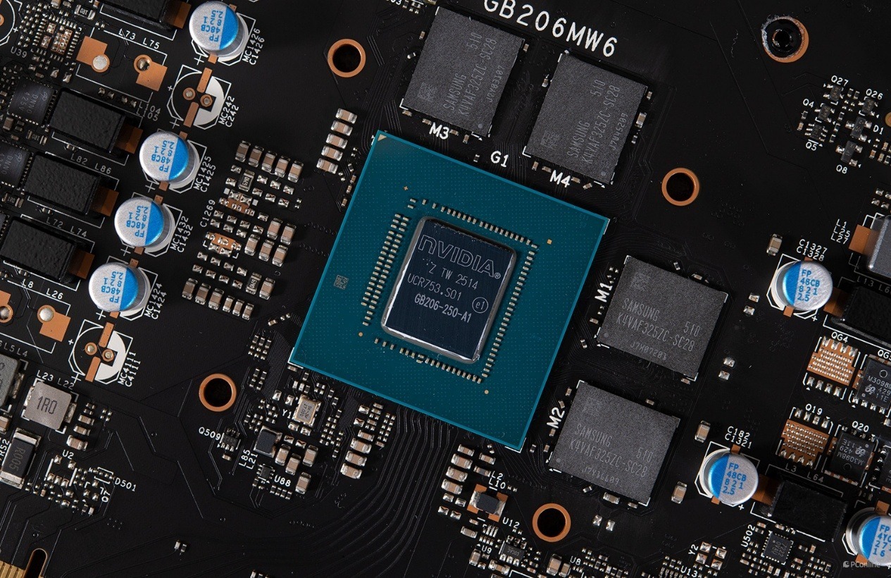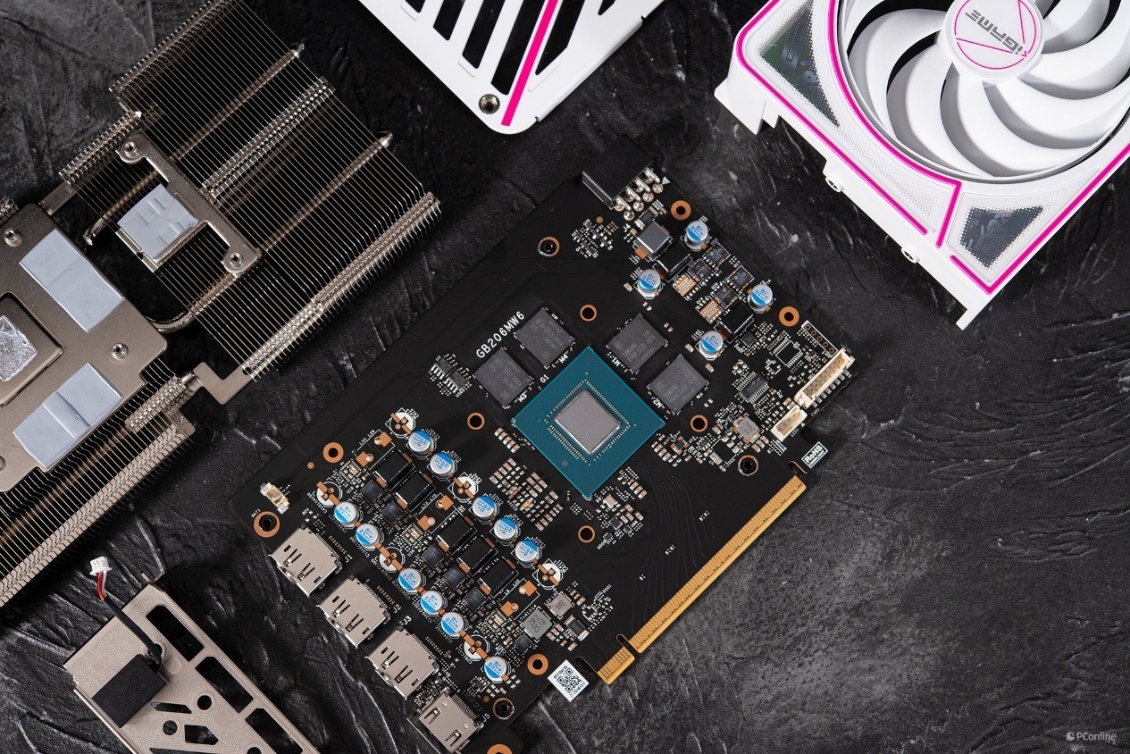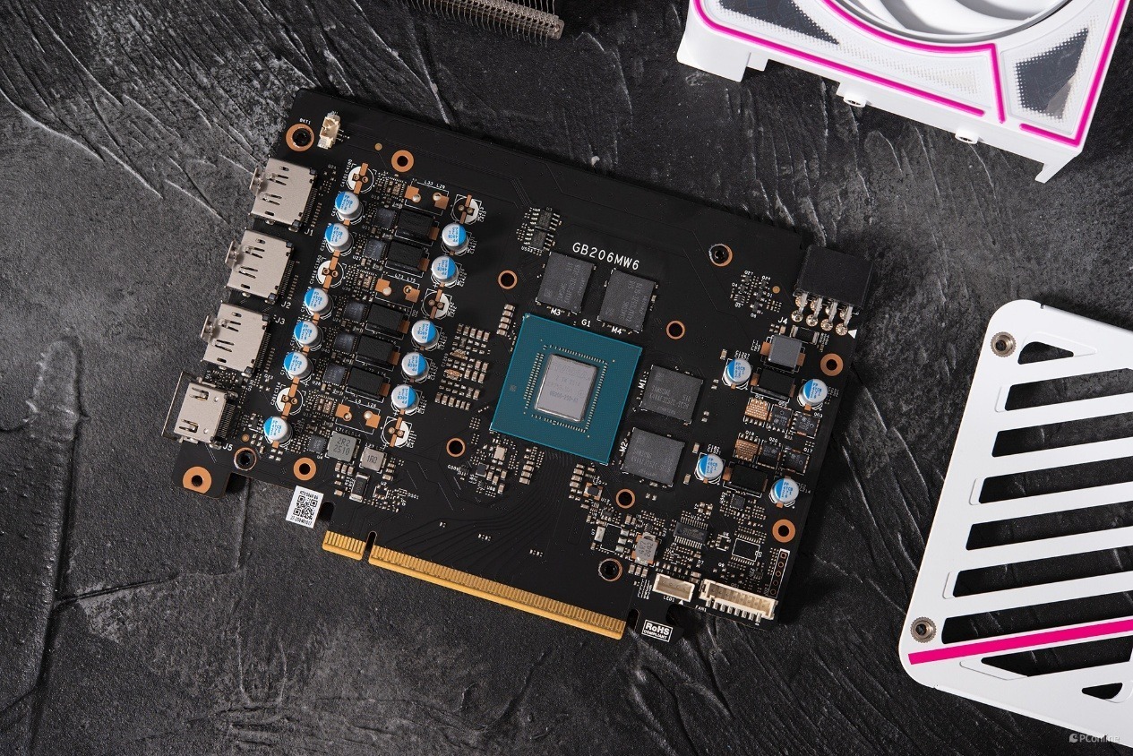 PCB的中央则是本次测试的重点,GB206-250-A1核心,它就是iGame GeForce RTX 5060 Ultra W DUO OC 8GB的大脑,由TSMC 4N工艺打造,拥有3840组CUDA核心,比前代RTX 4060足足多出25%,通用的图形性能自然更强。