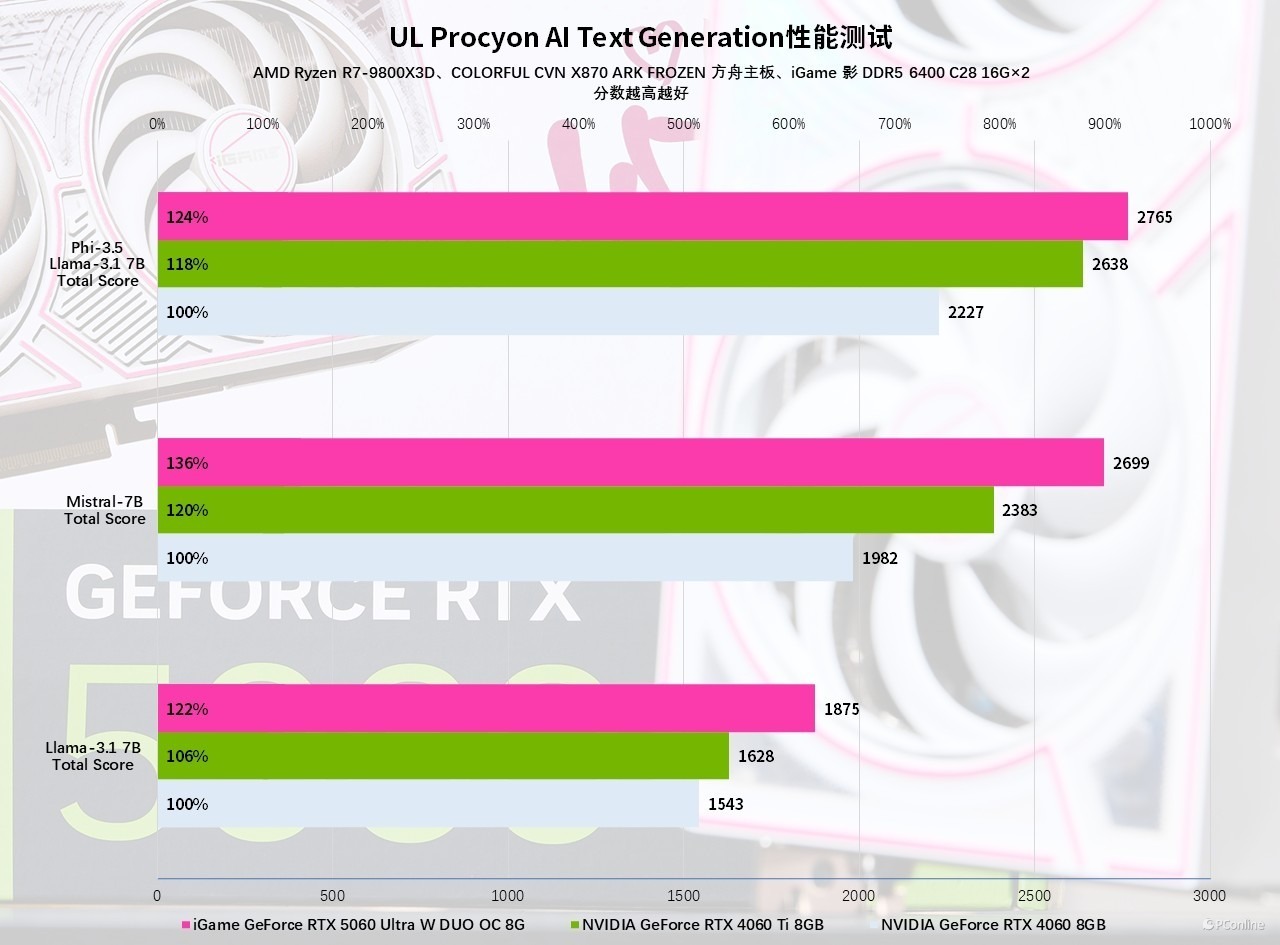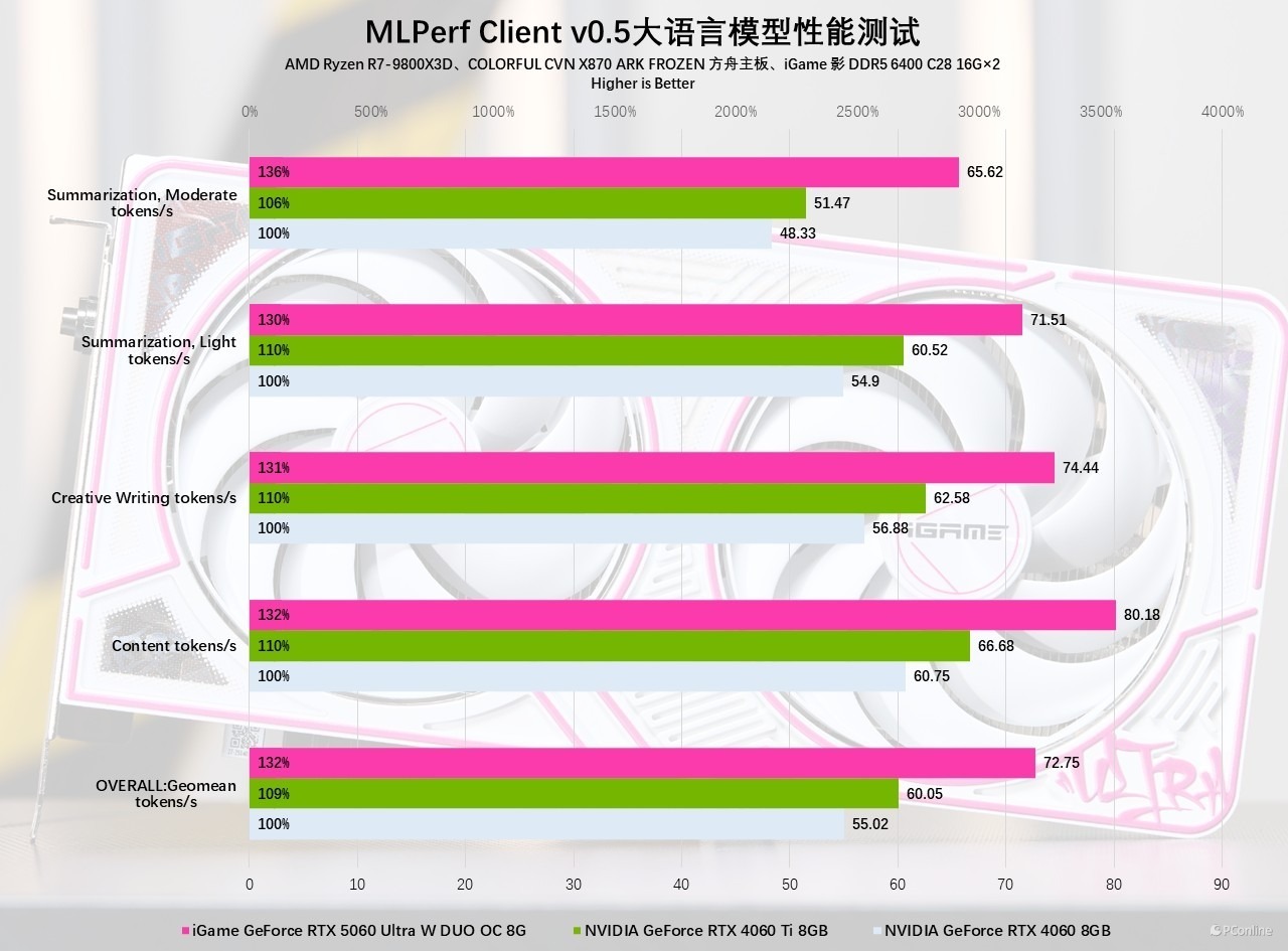 接着我们又用UL Procyon的AI Text Generation测试了更多的大语言模型,iGame GeForce RTX 5060 Ultra W DUO OC 8GB的优势依旧十分明显,综合性能对比RTX 4060提升约27%,面对RTX 4060 Ti,性能也有13%的领先优势。