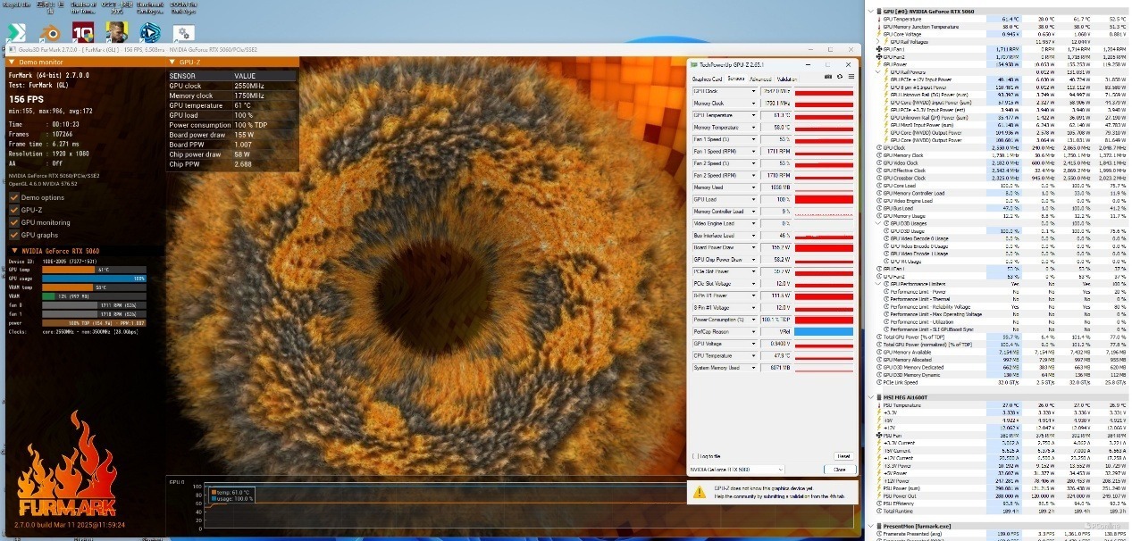 最后一项测试烤机,这也是许多玩家关注的重点。得益于iGame GeForce RTX 5060 Ultra W DUO OC 8GB出色的散热配置,整体表现非常出色。在室温20℃下,Furmark烧机10分钟后,整张显卡的温度并不高,核心仅有60度出头,显存温度则低于60度,非常凉快。显卡的功率则为155 W,风扇转速则是1700 RPM,噪音与温度控制优秀。当然,这款显卡开启一键超频模式,功耗还能进一步提升至165W,实现更强的性能输出。