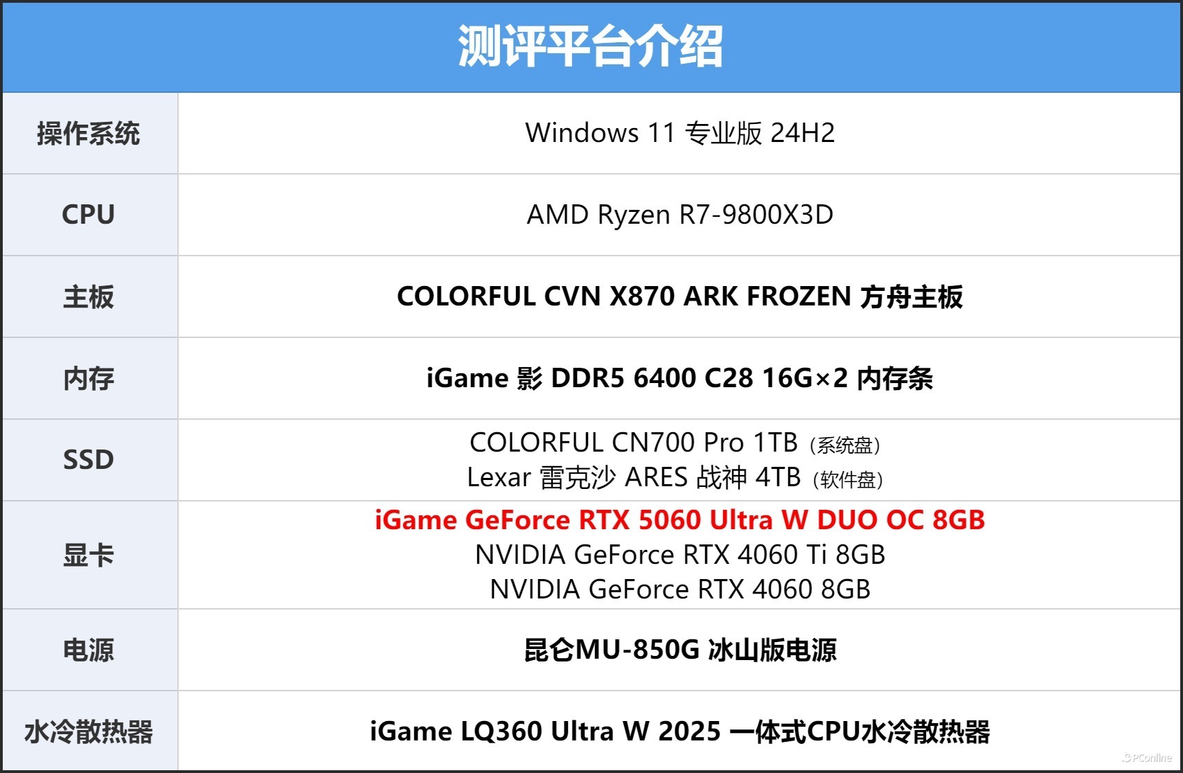 开始性能测试前介绍一下本次的测试平台,我们直接用的是七彩虹全家桶产品,涵盖了包括Ultra家族硬件的iGame GeForce RTX 5060 Ultra W DUO OC 8GB显卡、iGame C25A Ultra W机箱、iGame LQ360 Ultra W 2025一体式水冷散热器、iGame F12025D ARGB Ultra LITE(反叶)风扇和CVN X870 ARK FROZEN 方舟主板、iGame 影 DDR5 6400 C28 16G*2内存条、COLORFUL CN700 Pro 1TB固态硬盘,以及昆仑MU-850G 冰山版电源。