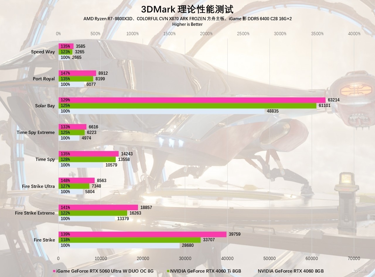 理论性能部分看3DMark,在Fire Strike系列测试中,iGame GeForce RTX 5060 Ultra W DUO OC 8GB表现非常亮眼,其中1080P分辨率下领先RTX 4060约40%左右,对比RTX 4060 Ti也可以做到21%的性能提升;2K下则可以领先RTX 4060约41%,领先RTX 4060 Ti约19%; 4K则差距最大,对比RTX 4060有48%的提升,对比RTX 4060 Ti则是21%。而在以DX12为代表的Time Spy测试中,新显卡同样逆天,对比RTX 4060,领先幅度为35%,而对比RTX 4060 Ti则是10%左右,整体性能提升还是非常可观的。