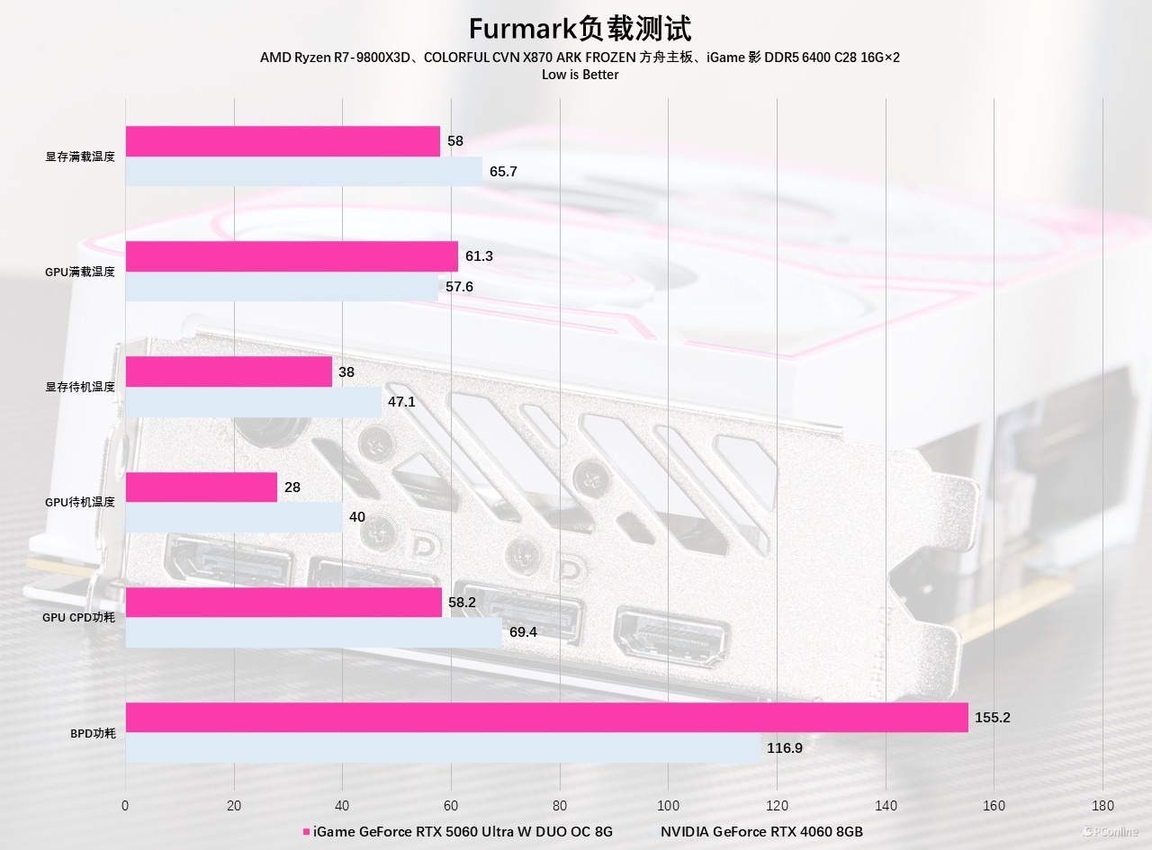 横向对比RTX 4060时可以看到,虽然新显卡的TDP提升了,不过整体的烤机功耗并不算高,iGame GeForce RTX 5060 Ultra W DUO OC 8GB整体的散热效果极其出色,待机时温度甚至比115W的RTX 4060还要低,属于是非常惊喜了。