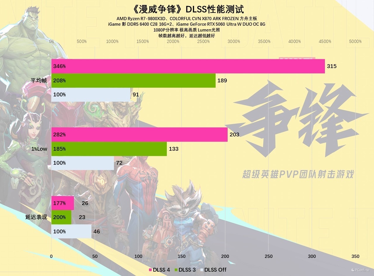 网游方面我们测的是《漫威争锋》,这款游戏在RTX 50系显卡首发之时,它还没有完全适配DLSS 4,玩家想要体验多帧生成功能还需要依靠NVIDIA App的DLSS 4优设功能。不过现在《漫威争锋》也正式支持DLSS 4了,与上面的游戏一样,玩家在游戏设置中就能直接开启,并且提供了2x、3x以及4x选项,玩家可以随意选择是插一帧、插两帧还是插三帧。