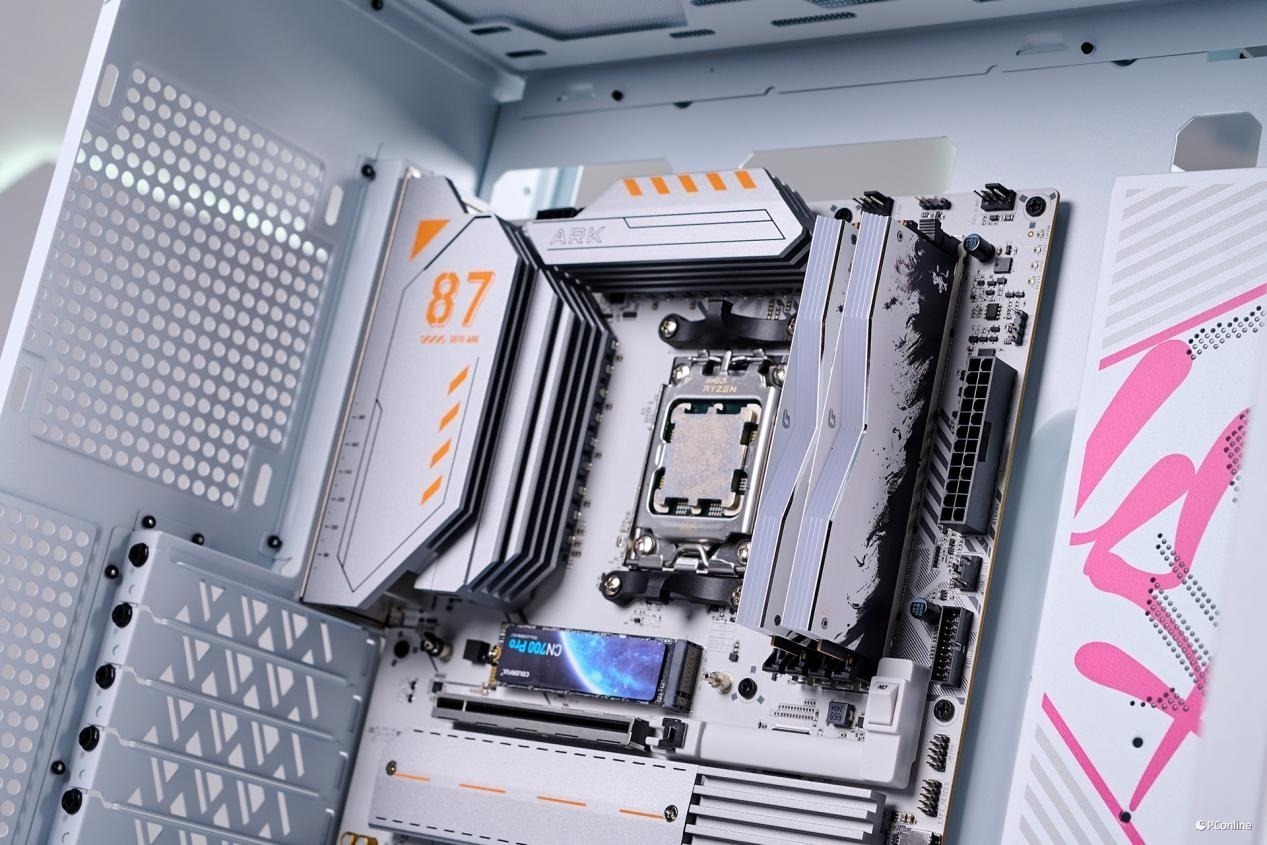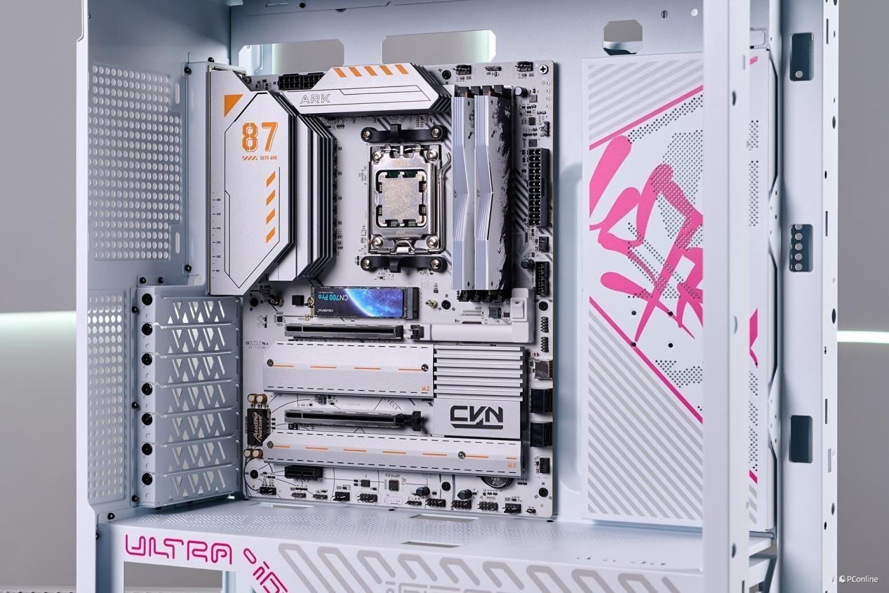 其中,CVN X870 ARK FROZEN 方舟主板是iGame最新推出基于AMD X870芯片组打造的全能、高性价比主板产品。颜值上,CVN X870 ARK FROZEN 方舟主板采用了白色PCB与钛灰色散热马甲的搭配,辅以黑色和黄色的点缀,既彰显了科技感,又不失个性化。同时其做工用料也相当不错,配备了14+2+1相强化供电设计,以及80A的DrMOS,能够轻松应对锐龙9 9950X3D等旗舰级处理器的挑战,确保系统运行的稳定性和高效性,并且搭载了显卡易拆装置,拆装显卡更加安全便捷。