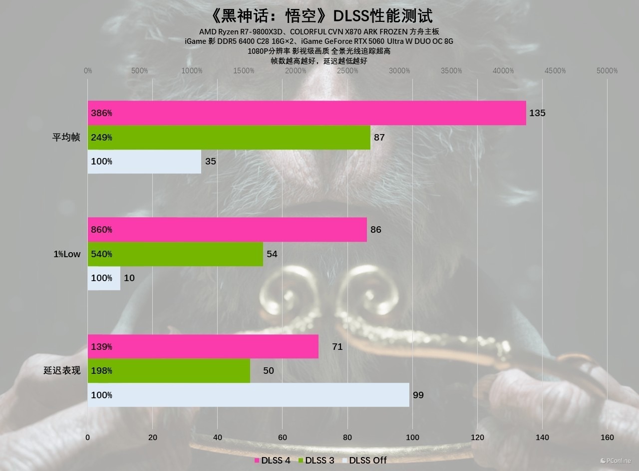 我们在1080P下将画质调整至影视级,全景光追也拉到最高,此时iGame GeForce RTX 5060 Ultra W DUO OC 8GB在不借助任何超分技术的条件下,游戏帧数仅有35 FPS。而有DLSS 3的帮助后,游戏帧数也回到了流畅的水准87 FPS;这时如果你有RTX 50系显卡,开启DLSS 4多帧生成以后,游戏帧数将再度飞跃,135 FPS的表现相当夸张,对比原生分辨率提升了快4倍,直接由可玩变爽玩了。