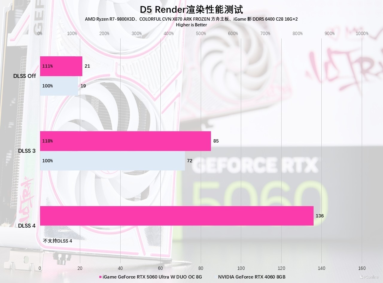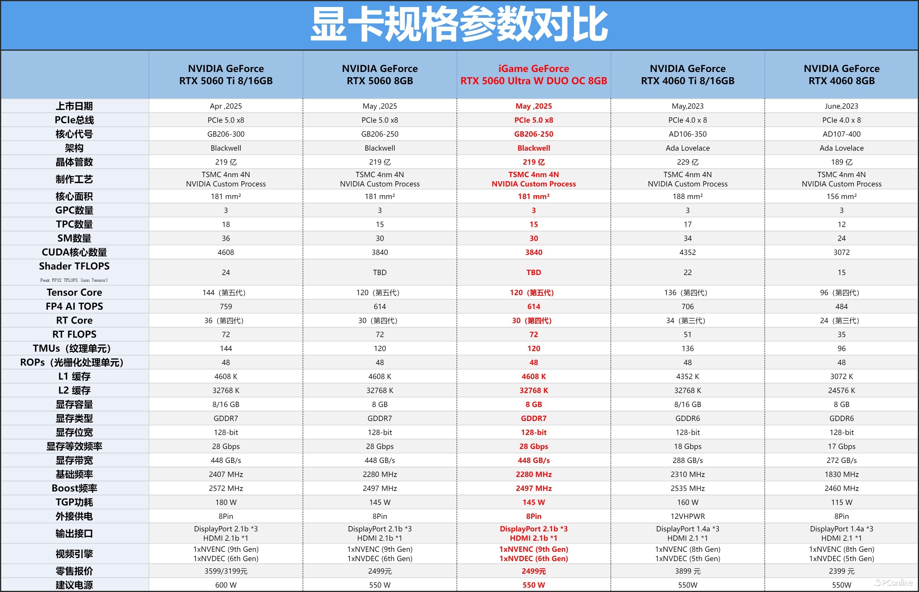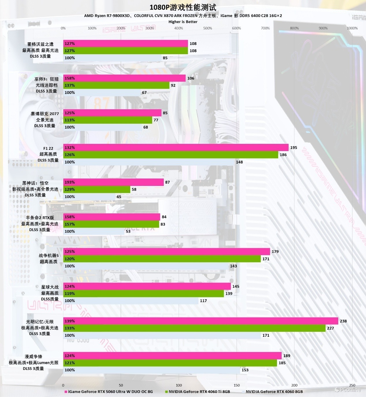 至于对标的测试显卡,我们这次拿出的RTX 4060 8GB、RTX 4060 Ti 8GB与iGame GeForce RTX 5060 Ultra W OC DUO 8GB进行性能对比,分别对理论性能、游戏性能、DLSS性能、创作能力、AI性能,以及功耗等不同维度的表现。