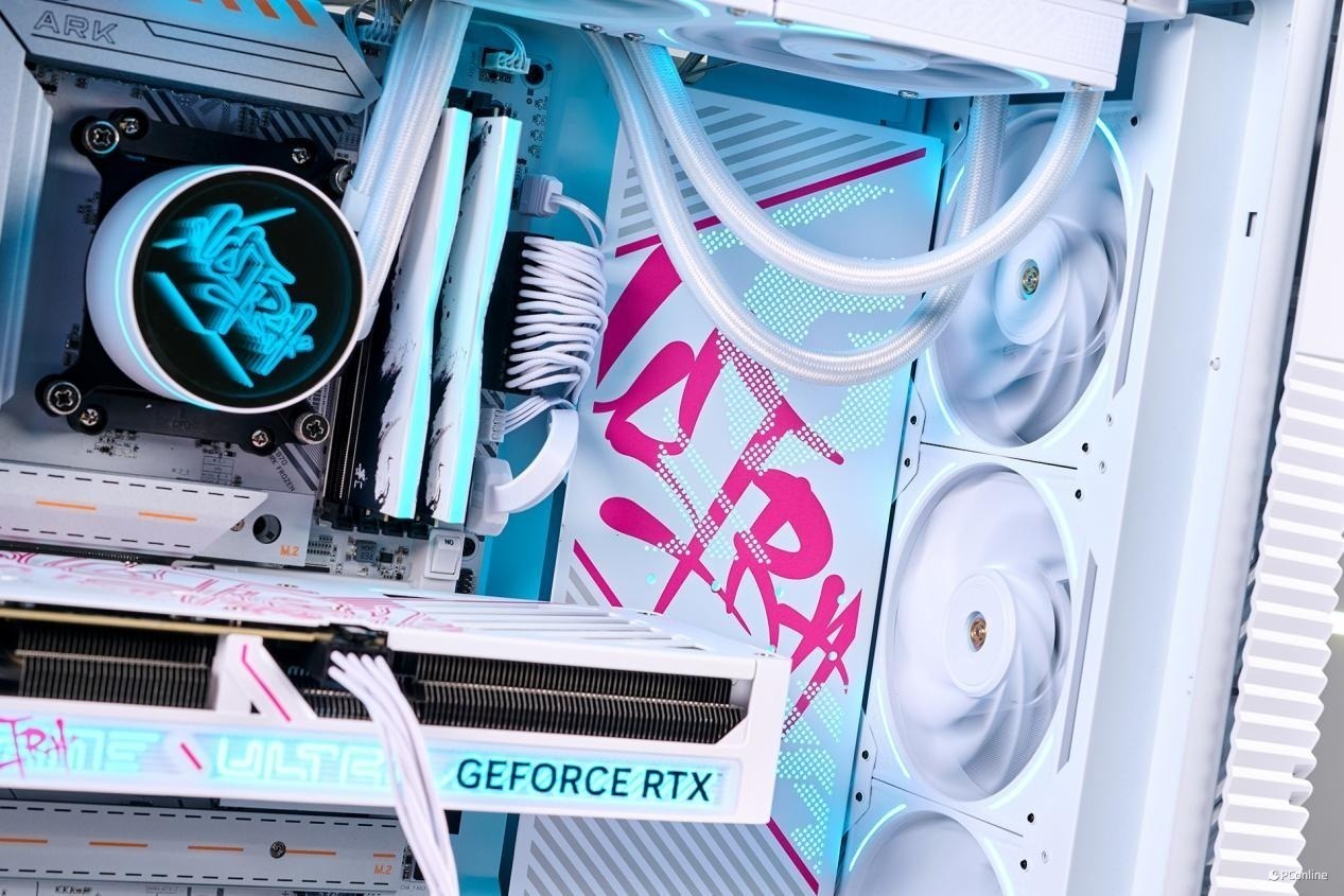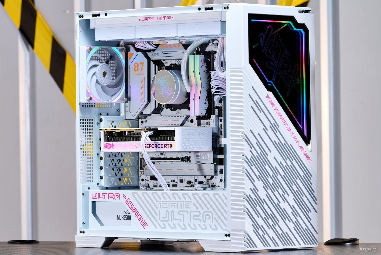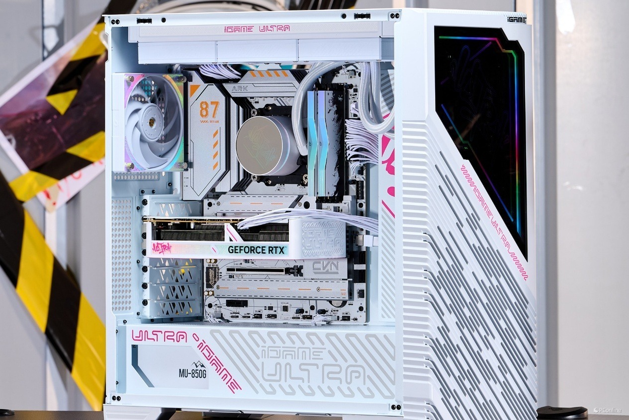 而为了压制AMD 锐龙9 9800X3D处理器,一体水冷散热器则是采用了iGame LQ360 Ultra W 2025。其外观超吸睛,通体纯白,与各类机箱风格都能完美适配。冷头更是采用 iGame 深渊镜设计,点亮后散发神秘深邃的光芒,和机箱前脸呼应,科技感爆棚。