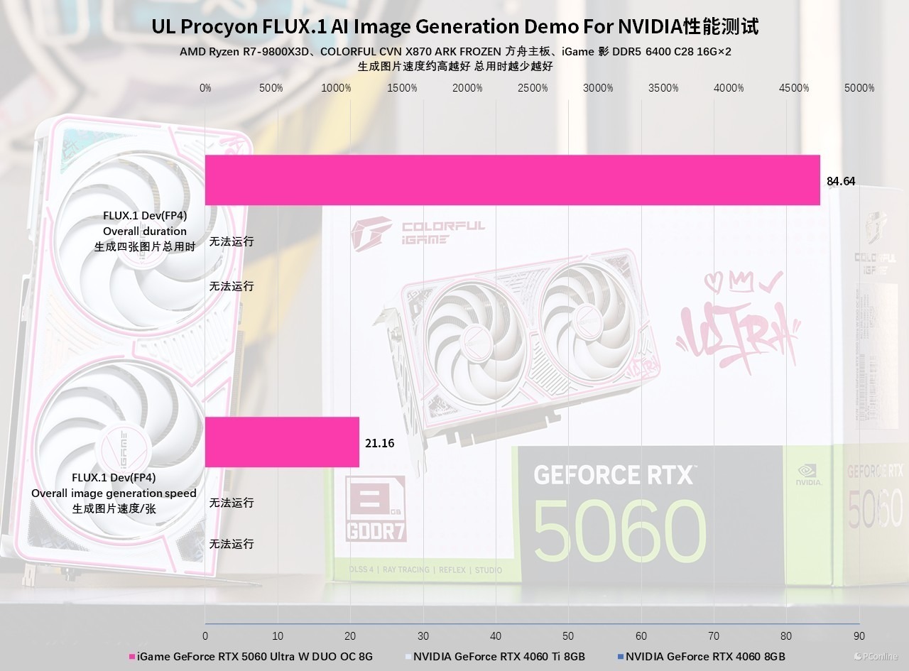 实测前代的两张60级别显卡因为显存不足,无法完成测试任务。而同样是8GB显存的iGame GeForce RTX 5060 Ultra W DUO OC 8GB凭借FP4精度模型的支持,能够顺利跑完测试,生成一张图片的用时为21.16秒,表现还不错。