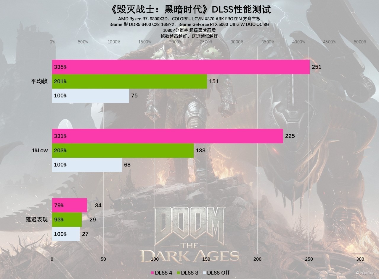 最后一款游戏我们测的是最近刚支持DLSS 4的《毁灭战士:黑暗时代》,实测iGame GeForce RTX 5060 Ultra W DUO OC 8G显卡在1080P分辨率、超级噩梦画质下,表现还是非常不错的,即便不开启超分,也能流畅游戏;开启DLSS 3质量档后,游戏帧数已经能够满足高刷需求了,接着启动DLSS 4质量档后,游戏帧数更是来到了250 FPS以上,完全的爽玩水准。