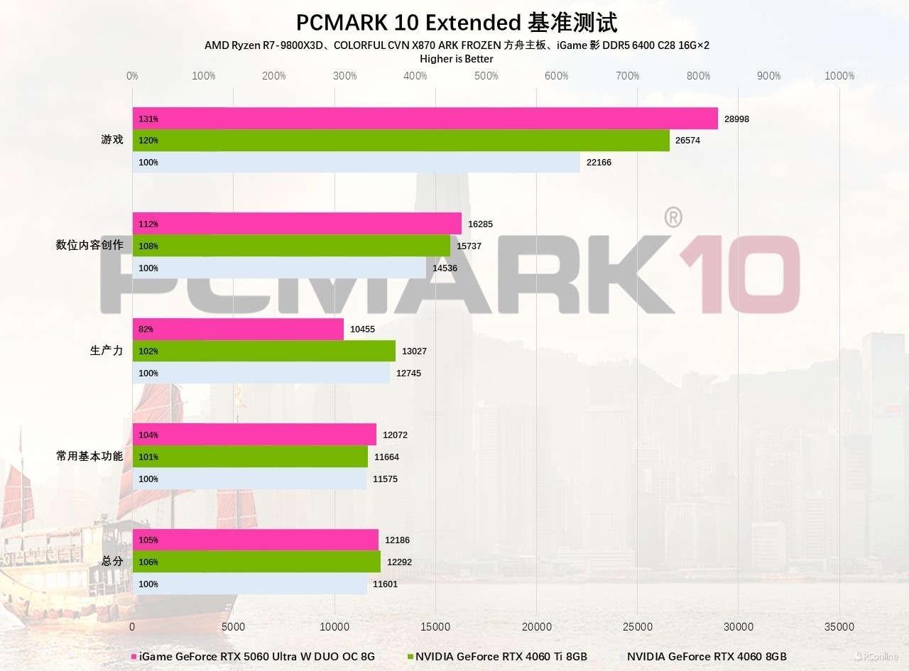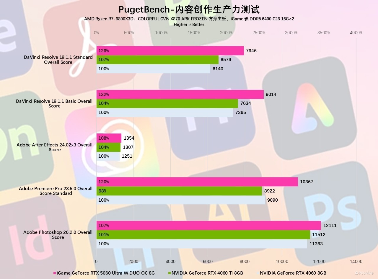 看过了游戏,下面就是专业创作领域的内容了。先给大家伙看一下综合场景的性能表现,在PCMark10 Extended测试,iGame GeForce RTX 5060 Ultra W DUO OC 8GB在游戏、数位内容创作方面的表现更佳,基本上要比RTX 4060高12-31%左右,对比RTX 4060 Ti则是10%左右的提升。而生产力方面的成绩则比较低,推测是目前驱动还不完善所致。