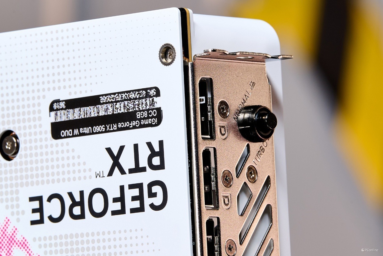 RGB灯条的上方则是这款显卡的供电接口,不同于其他RTX 50系显卡,iGame GeForce RTX 5060 Ultra W DUO OC 8GB为单8Pin接口,熟悉的感觉又回来了,应对默认功耗145W/145W,一键超频功耗155W/165W 也是完全足够的。