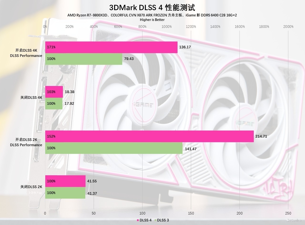 简单介绍完,我们再看看DLSS 4的理论表现如何,还是经典的3DMark测试。不得不说iGame GeForce RTX 5060 Ultra W DUO OC 8GB搭配上DLSS 4后,帧数就跟打了鸡血一样,开关前后的性能简直天壤之别!其中2K分辨率下,开关前后性能差距足足有4倍之多。4K分辨率时帧数差距直接就是7倍。