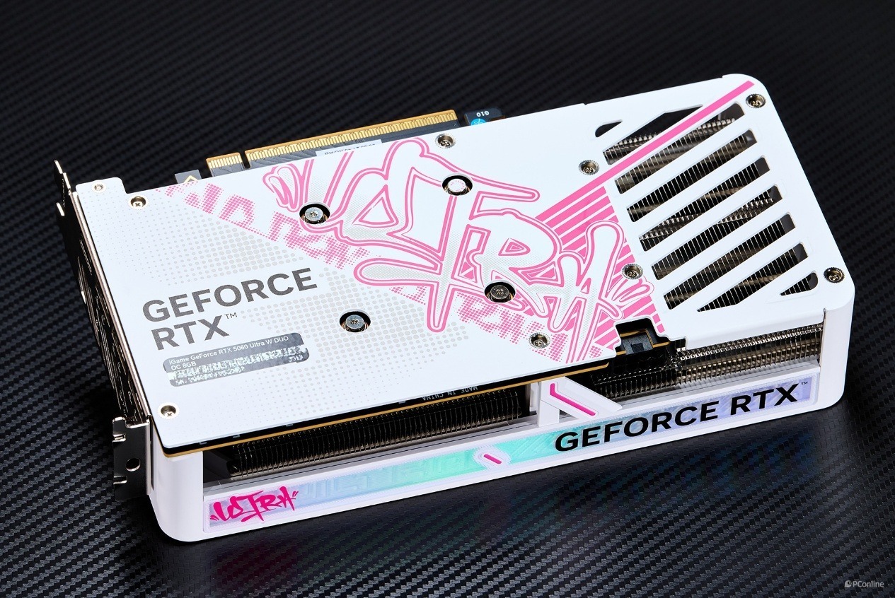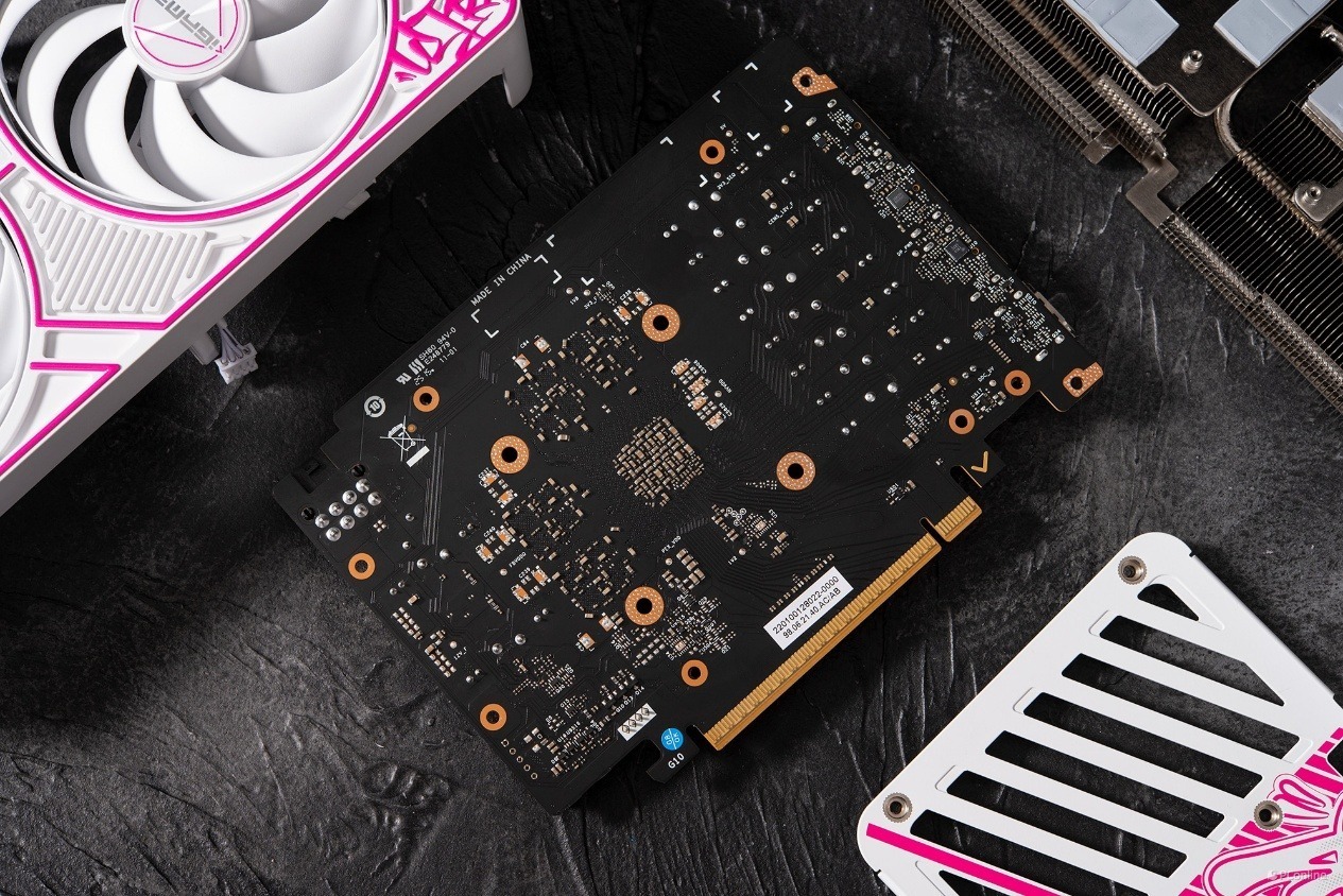 背板的一侧则是镂空散热设计,能够增加空气的流通路径,进一步提升了散热效能,确保显卡在长时间高负载运行时也能保持冷静,稳定发挥性能。