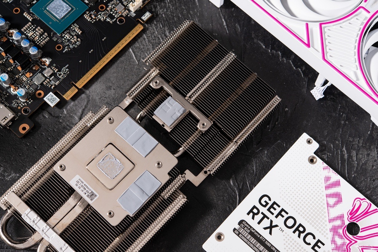 至于散热器方面,iGame GeForce RTX 5060 Ultra W DUO OC 8GB采用了“嘻哈”散热器,该散热器由纯铜底座、大面积散热鳍片以及两把90mm风扇组成。纯铜底座经过精密加工,能够紧密贴合GPU核心,确保热量能够迅速传递至热管。