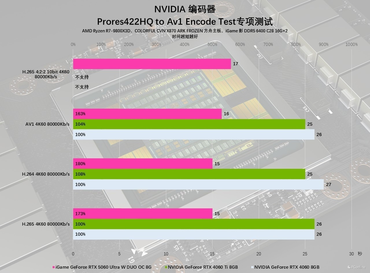 值得一提的是,GeForce RTX 50系显卡还能够支持4:2:2色度取样的视频编解码,这将节省CPU的负担,加快创作速度。上面的图表里也可以看到我们的测试成绩,实测导出时间会比上代显卡快不少,毕竟RTX 40系显卡不支持该功能,仅支持4:2:0色度采样,如果一定要4:2:2导出只能靠CPU软解。