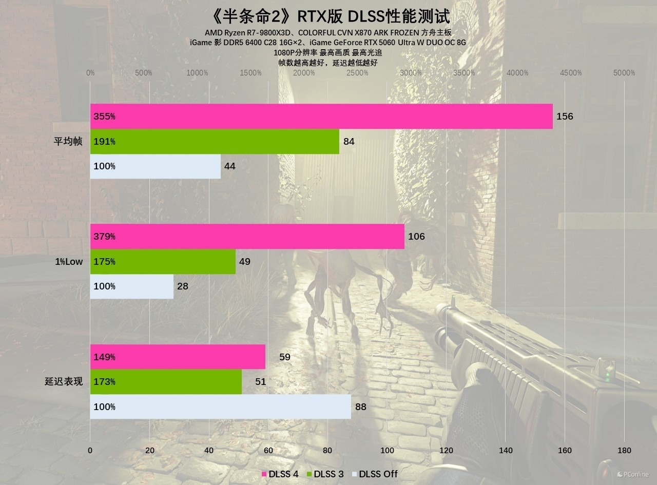 实测下来,只能说《半条命2》RTX版对硬件的开销极大,在原生1080P分辨率下,所有画质、光追均开至最高,不开启超分选项时,iGame GeForce RTX 5060 Ultra W DUO OC 8GB帧数为44 FPS。在开启DLSS 3质量档以后,游戏帧数来到了84 FPS,几乎快摸到高刷的门槛了,而继续开启DLSS 4质量档,游戏帧数飙升至156 FPS,对比原生1080P的表现,性能提升高达3.5倍!1%Low的表现也差不多,领先幅度接近4倍。