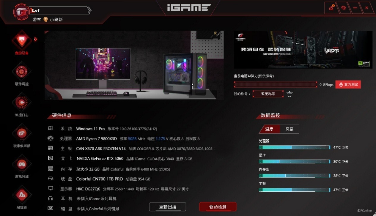 另外,iGame自在星球软件除了能够方便调整硬件参数,iGame还深谙现在年轻人的喜好,推出了AI 桌宠“柒小希”,这是iGame 推出的原创IP虚拟代言人,也是iGame 自在星球(原iGame Center)的核心模块,它在人机交互方面扮演着关键角色。玩家可以利用语音指令实现硬件的精确控制。例如,当玩家说出“游戏卡顿”,她能够运用AI智能超频技术对CPU进行优化,并调整内存分配;同时,她还能通过AI算法检测电脑的健康状况,支持查看系统配置和硬件状态,实时监控CPU、GPU等组件的运行数据,帮助用户高效管理硬件。