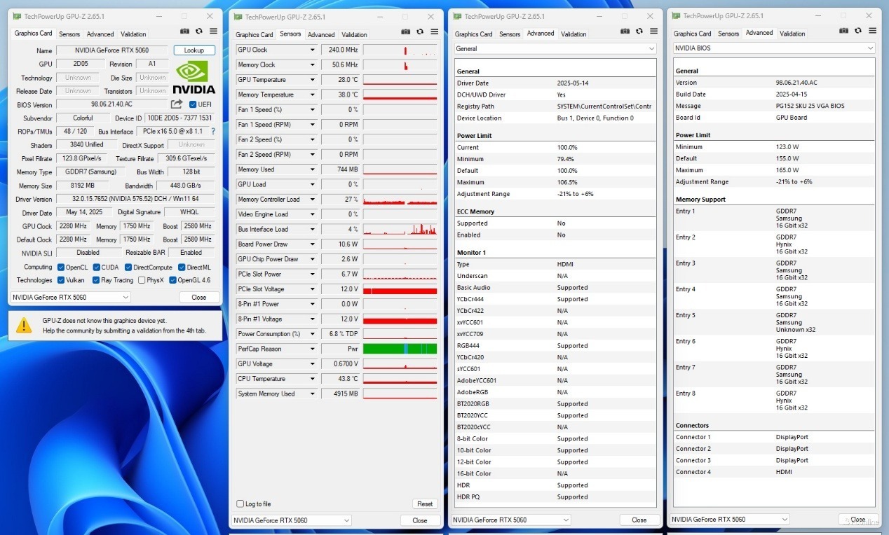 开始测试前,照例还是要“认识”一下这张显卡。从GPU-Z的信息中可以看到iGame GeForce RTX 5060 Ultra W DUO OC 8GB的基准频率为2280 MHz,Boost频率为2580MHz,毕竟是带着OC后缀的型号,其Boost频率对比MSRP版本的RTX 5060要高出不少,由2497 MHz提升到了2580 MHz,这也意味着其性能释放更强劲一些。除此之外,这张显卡的TDP也比前代稍高一些,为145 W。并且换装了更高级的GDDR7显存,能够带来448 GB/s的显存带宽,对比前代的272 GB/s提升明显。