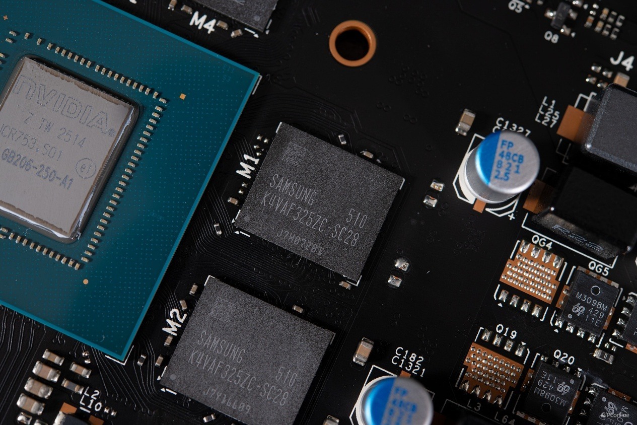 核心的四周是4颗GDDR7显存,由三星提供,显存型号为K4VAF325ZC-SC28,内部是512M×32的架构,数据频率可达28Gbps,单颗容量2GB,共组成8GB。