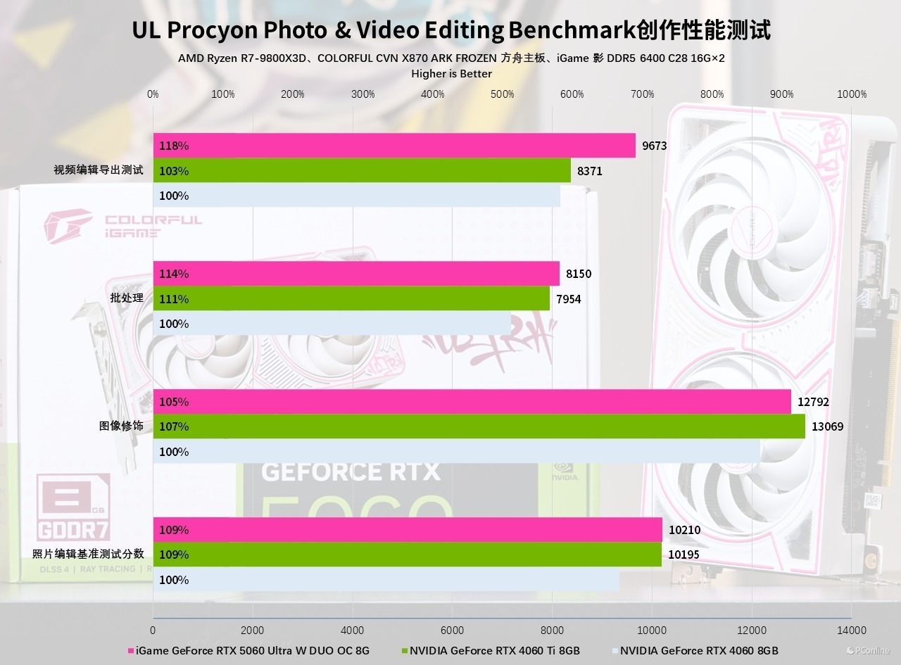 再看大伙关心的图像编辑与视频创作表现,我们采用UL Procyon进行测试,在图像编辑上iGame GeForce RTX 5060 Ultra W DUO OC 8GB与RTX 4060 Ti不相上下,不过对比RTX 4060时,性能领先9%左右,而在视频剪辑方面,iGame GeForce RTX 5060 Ultra W DUO OC 8GB的优势就比较大了,对比RTX 4060以及RTX 4060 Ti分别领先18%和15%。