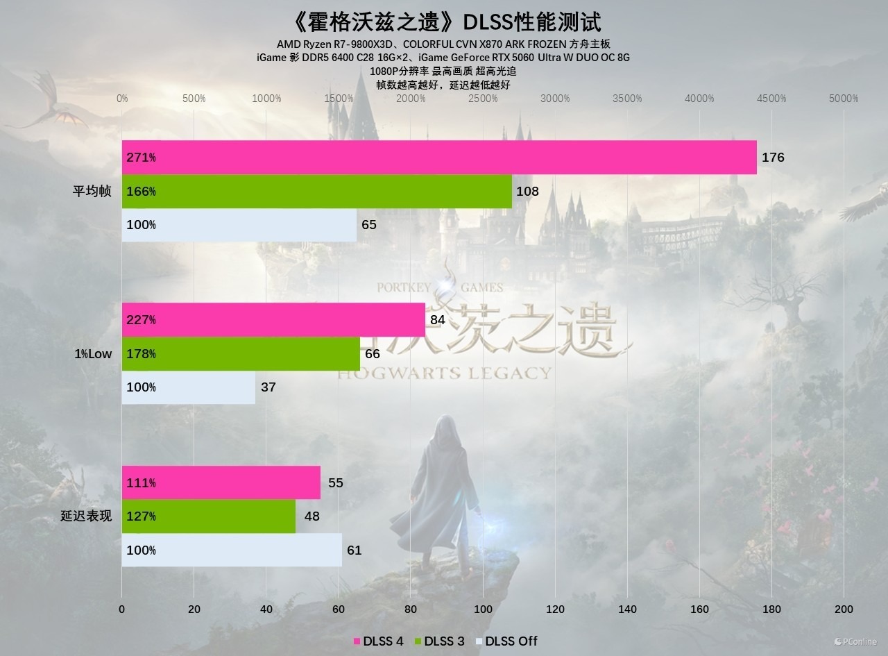 实际测试过程中,我们发现《霍格沃兹之遗》这款游戏优化还是不错的,1080P分辨率画质光追均设置最高的情况下,iGame GeForce RTX 5060 Ultra W DUO OC 8GB在不开任何超分的情况下,平均帧为65 FPS。如果开启DLSS 3质量档,此时帧数已经能够做到108 FPS了,属于是高刷与画质的完美组合,体验相当丝滑。开启DLSS 4以后,帧数可以进一步提升至176 FPS,对比原生1080P的表现,性能提升了约3倍左右。