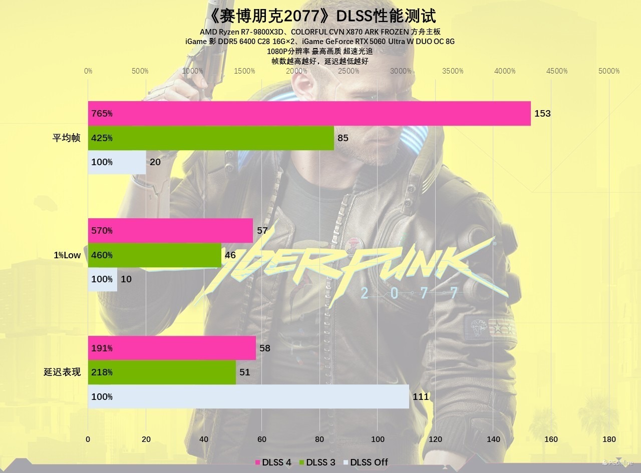 见识完Transformer模型的魅力以后,我们再来看DLSS 4的性能表现,毕竟是“显卡杀手”,对显卡的压力确实不一般,在最高画质+路径追踪的情况下,iGame GeForce RTX 5060 Ultra W DUO OC 8GB只能跑20 FPS。开启DLSS 3以后,游戏帧数为85 FPS,体感已经非常流畅了。开启DLSS 4以后,iGame GeForce RTX 5060 Ultra W DUO OC 8GB能够做到153 FPS,对比原生分辨率,性能足足提升了7.6倍,这在以前的甜品卡身上,完全不敢相信。