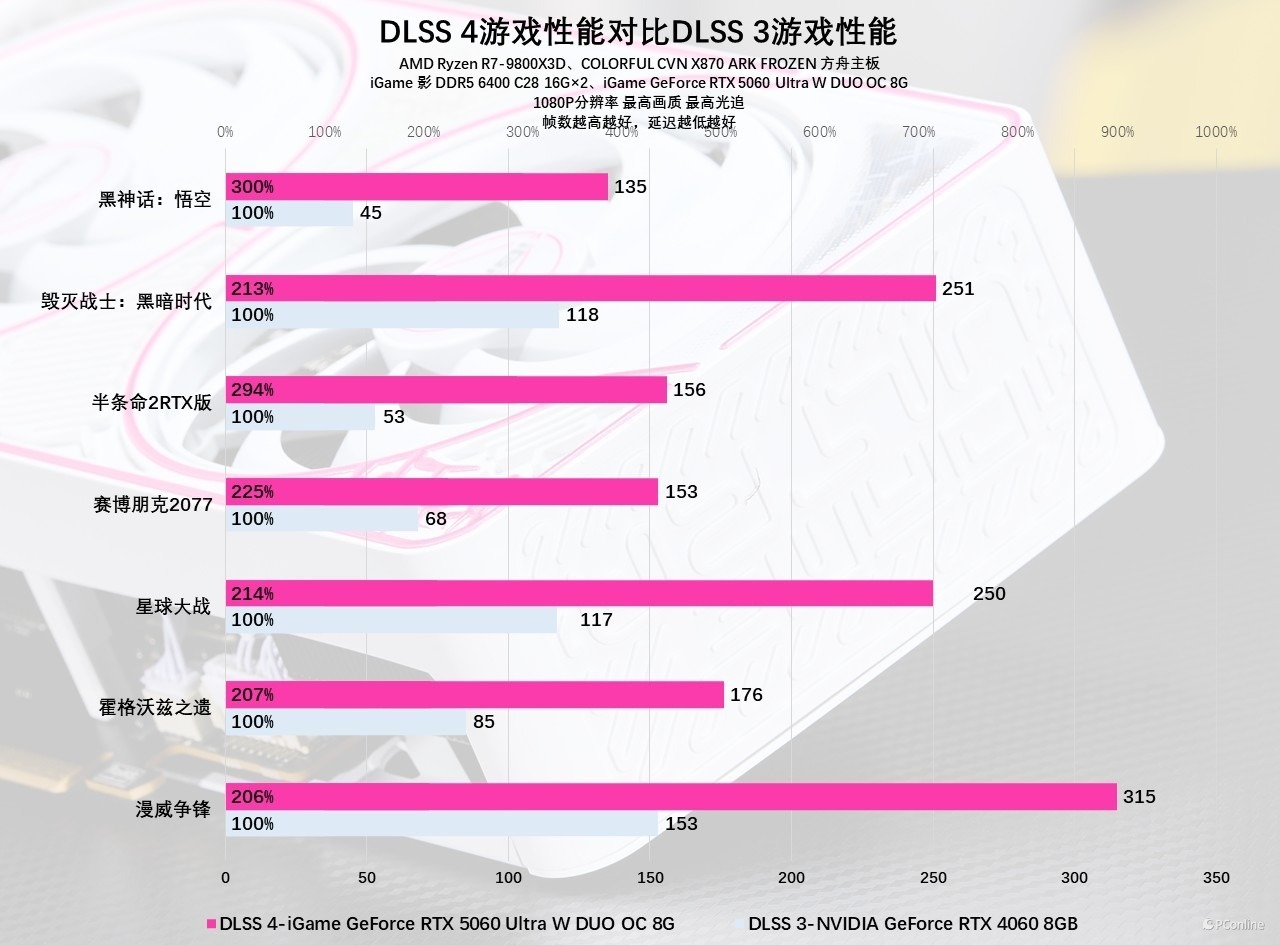 首先,性能方面就带给不少玩家惊喜,实测iGame GeForce RTX 5060 Ultra W DUO OC 8GB在绝大部分3A游戏中,性能相比上一代的RTX 4060提升明显,1080P下强约20-30%左右,部分游戏在仅DLSS 3的加持下就有200+ FPS的出色表现。对比RTX 4060 Ti也是毫不逊色,领先幅度也有10%左右。而在DLSS 4技术的加持下,这款显卡则更显出众,与上代显卡的性能差距甚至可以用倍数去衡量,非常夸张。
