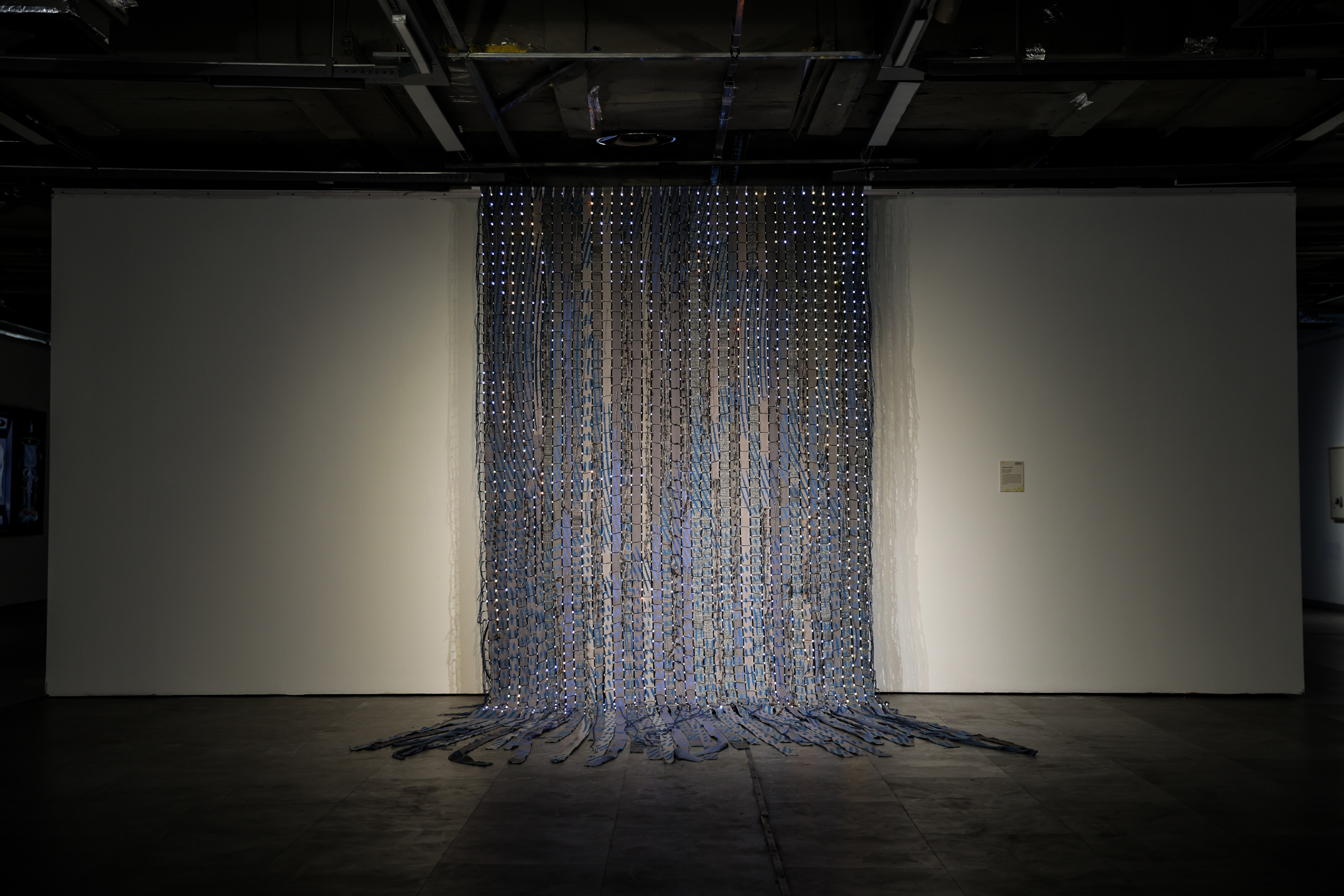 新媒体艺术家、纤维艺术家张弘、王薇、谢美华共同完成的《Photonic Fabric》是一件探索光、材质与互动性的纤维互动艺术装置。作品将手机拍摄产生的摩尔纹转化为织物纹样,嵌入LED构建动态交互场域。观众靠近时,触发织物中的光纹波动,人与织物形成双向干扰:织物如信息网络捕捉人类活动,LED反馈的光污染又反向侵入感知。传统编织与数字元件的纠缠,隐喻技术与人互为寄生——我们创造数据洪流,亦被其重塑行为模式。