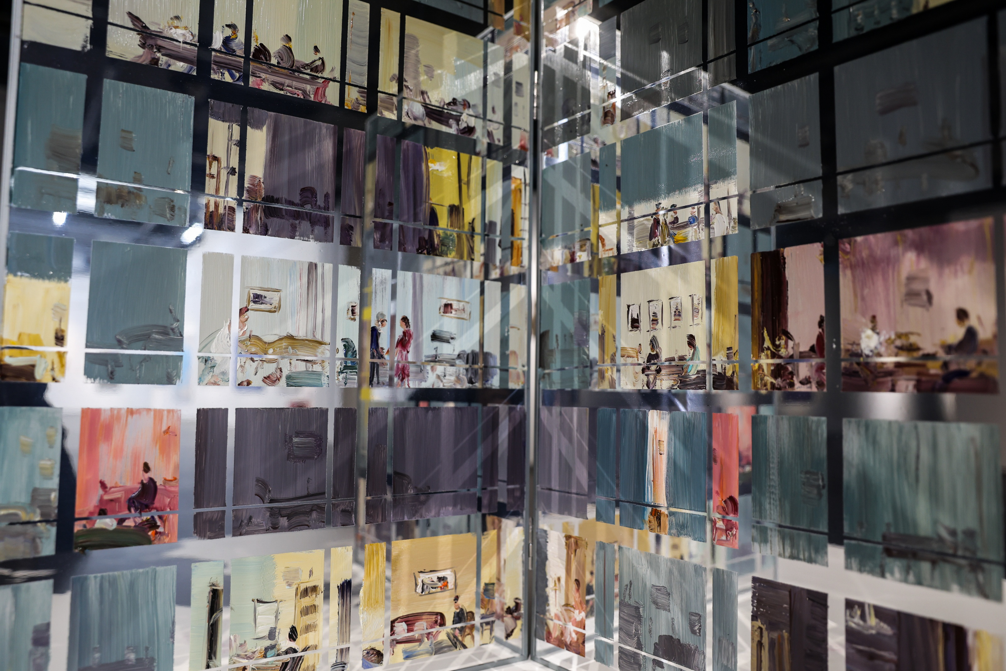艺术家杜海军的镜面油画《魔都镜像》则以铝板镜面为「画布」,描绘了上海城市楼群的窗户景观,窗内用中国画写意手法描绘了城市生活场景,并进行浓缩和夸张,采用现代化切割。通过镜面铝板的映照,作品徬彿翻开的书页,通过灯光在书本上照射形成反光,在桌面形成纵横交错的光芒,二画面空出的部分能照出观众,徬彿人在画中。