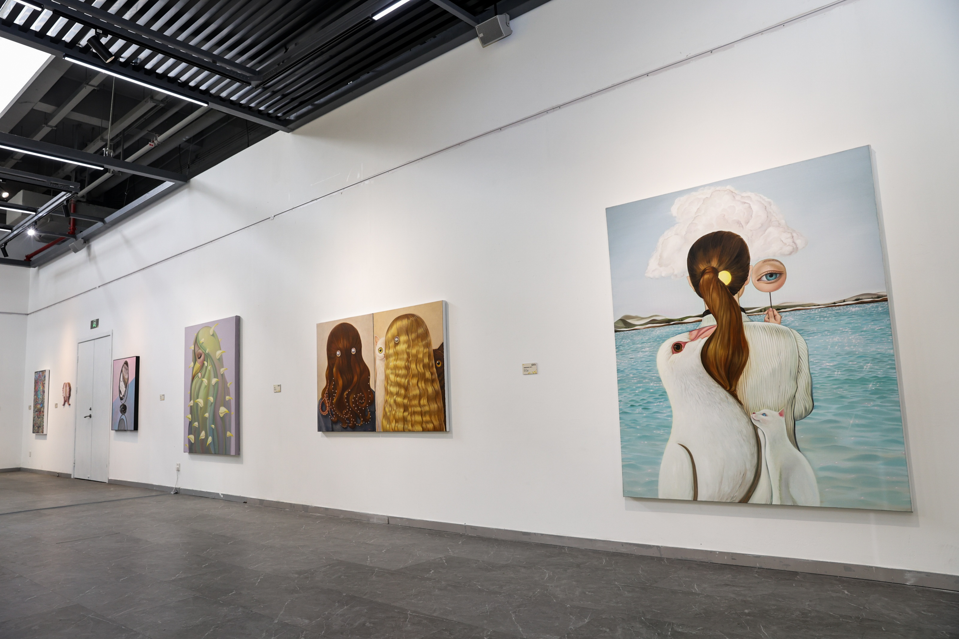展览在空间布局上也更为灵活,以车库美术馆为中心,延伸到浦东新区文化艺术指导中心的品艺廊、西楼大厅等多个艺术空间,将整个建筑转化为沈浸式展厅:青年艺术家杨纳的系列油画里,眼睛与动物的元素贯穿始终,蜿蜒的章鱼与少女的秀发融为一体,少女巨大的眼眸和一粒沙对视,每幅作品都徬彿一个看不见的镜子,映照着主人公,回答著「someone like you」的主题。