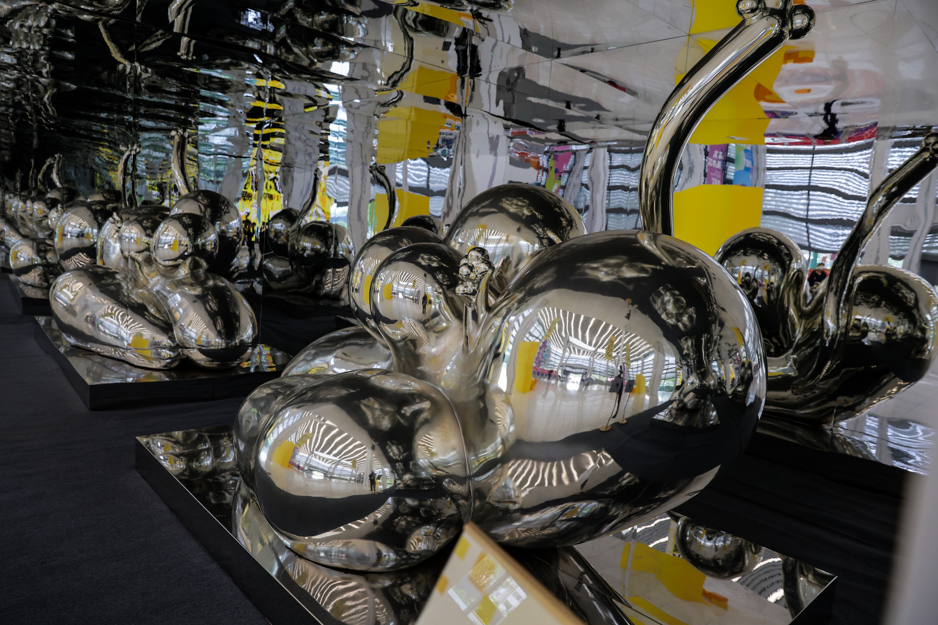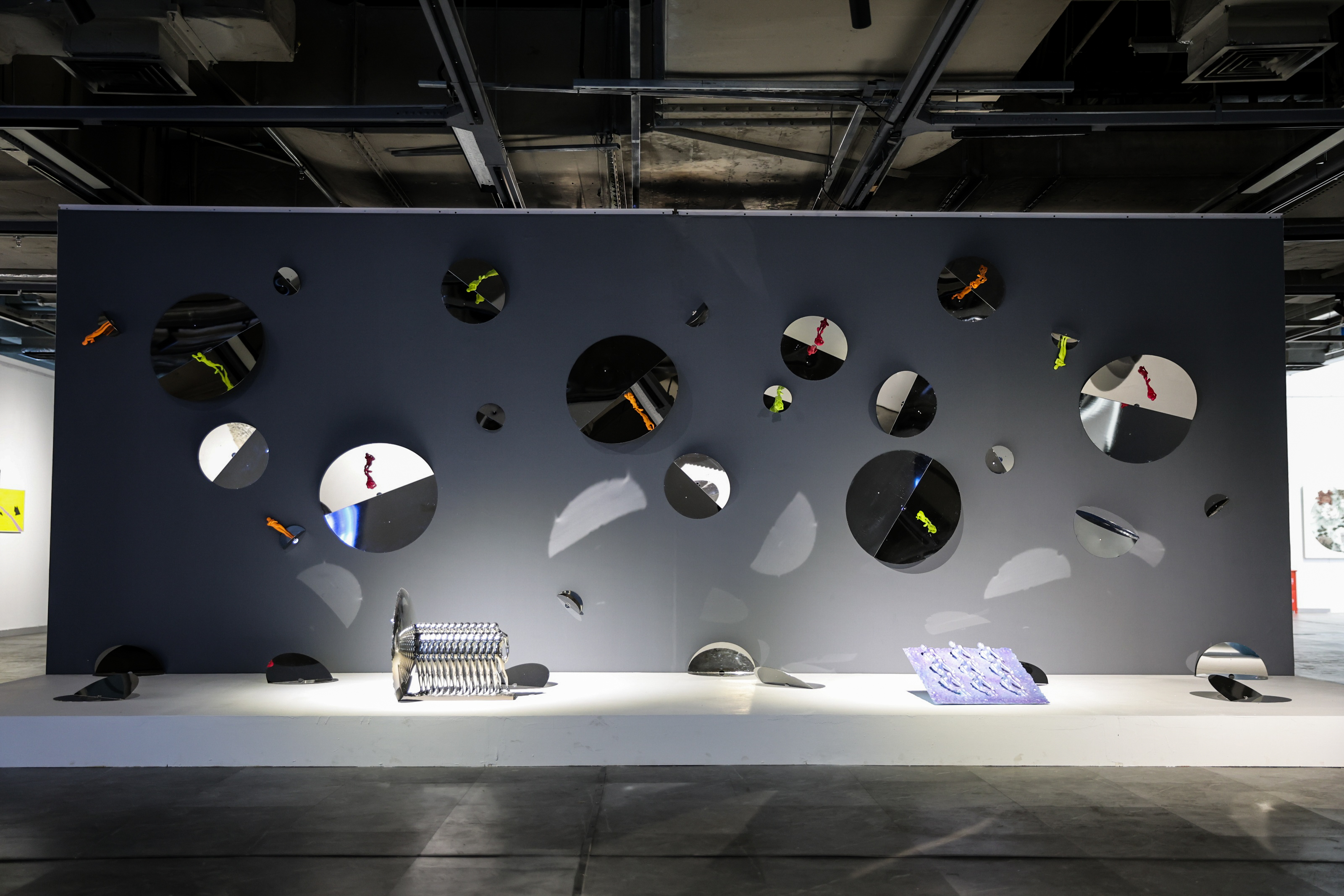 当代艺术家秦岭带来了以「平行空间」命名的系列作品,运用了 镀钛、烤漆、不锈钢镜面等材料,通过材料对光与色的折射与变幻,将多维的影象相互交叠,让观者放慢脚步,展现人们对世界的认知被不断定义、推翻、再定义的过程,以及这个过程中思维的不断突破、拓展。