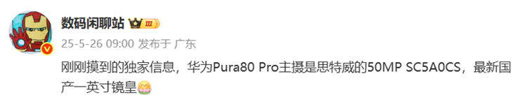 根据数码闲聊站的最新消息,华为Pura80 Pro将会搭载思特威的5000万像素传感器,型号为SC5A0CS,这将会是最新的国产1英寸镜皇。
