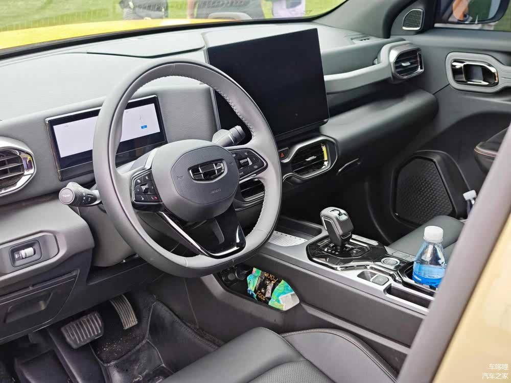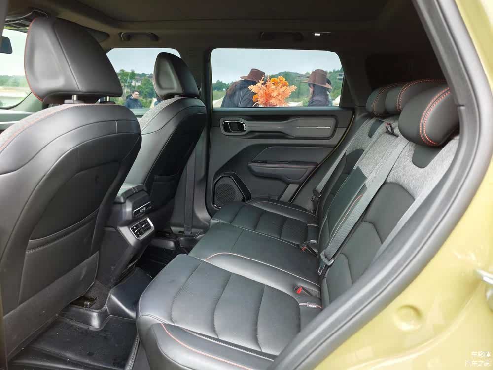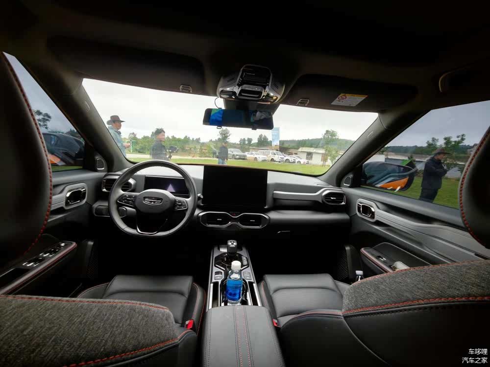 吉利牛仔以机能风为设计主线:副驾前方的金属扶手、车门处的防滑握把,延续了越野场景的功能性设计;而皮质与牛仔布拼接的座椅、14.6 英寸悬浮中控屏 + 8.8 英寸全液晶仪表的双屏组合,则注入了都市精致感。搭载 Flyme Auto 智能车机系统,支持语音控制、在线导航及 OTA 升级,操作流畅度与功能丰富度领先同级。空调出风口、座椅缝线等细节处融入的铆钉元素,暗合硬派主题,展现设计团队对粗粝感与细腻感的精准拿捏。舒适性配置同样可圈可点:主驾 6 向电动调节(趣野版额外支持副驾 4 向调节)、前排座椅加热(趣野版专属)。值得一提的是,车内甲醛含量低于国标 50%,配合 CN95 空调滤芯,对于家庭用户来说这种健康座舱环境是非常重要的。