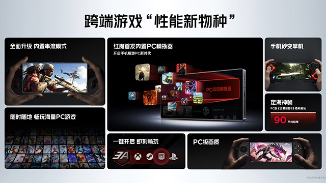 红魔10S Pro系列不仅在手机性能配置上尽显强悍,还实现了超越传统手机的功能突破,实现与PC游戏领域的跨越。通过自研转译引擎+跨端转译技术,打通技术壁垒,实现一机双端。整机借助红芯R3 Pro芯片增强画质,支持PC游戏一键直连,键鼠、手柄等外设即插即用,还有显示器投屏以及串流直连功能,深度集成PC游戏生态,首次实现手机端无缝畅玩PC游戏,开启移动端跨端游戏新纪元。