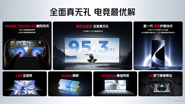 此外,双独立IC触控肩键,520Hz的超高触控采样率,搭配2500Hz屏幕瞬时触控采样率与MagicTouch 2.0技术带来了毫秒级的触控响应时间。让玩家的每一个操作都能迅速得到反馈,在激烈的团战中,释放技能、走位、补刀闪避一气呵成,敌人刚抬手准备攻击,你已凭借毫秒级的触控响应,先发制人完成反杀,真正做到快人一步,制胜出击。