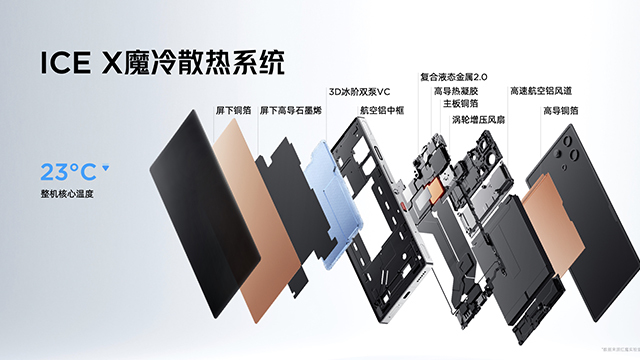 在狂暴性能稳定输出的背后,都离不开强劲散热系统的支撑。红魔10S Pro系列搭载了行业领先的ICE魔冷散热系统,采用液态金属2.0+风冷散热的组合方式,将液态金属直接贴合在CPU 热源上方,导热效率较前代提升250%,液态金属导热面积提升30%,配合高导热合金材质保障安全性,使CPU核心温度再降5℃,为强悍性能输出提供坚实保障,再次定义了电竞旗舰的散热标杆。