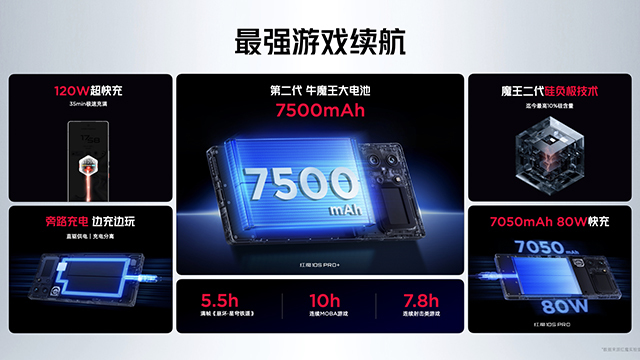 性能狂飙火力全开的底气,是红魔对续航的全新突破。随着红魔全系电池正式迈进“7 时代”,红魔10S Pro+搭载的第二代牛魔王电池,以魔王级能量密度再创容量巅峰。魔王二代硅负极技术与双电芯并联方案,使容量攀升至7500mAh,在极致性能和满帧运行的同时启动的情况下,重度游戏续航可达10小时。120W魔闪快充35分钟满血,配合旁路充电技术,边玩边充不伤电池,彻底终结续航焦虑症。