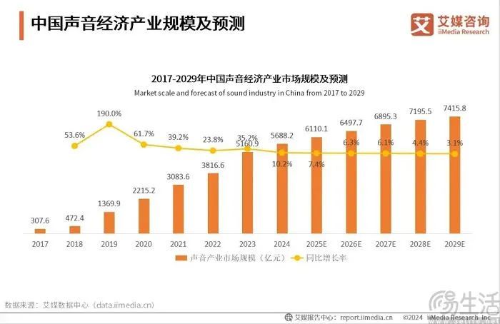 另一方面,音频内容本身也蕴含着庞大的经济价值。艾媒咨询的相关数据就显示,2024年中国在线音频用户规模已经达到7.4亿人,中国声音经济产业市场规模5688.2亿元,预计2029年将突破7400亿元。