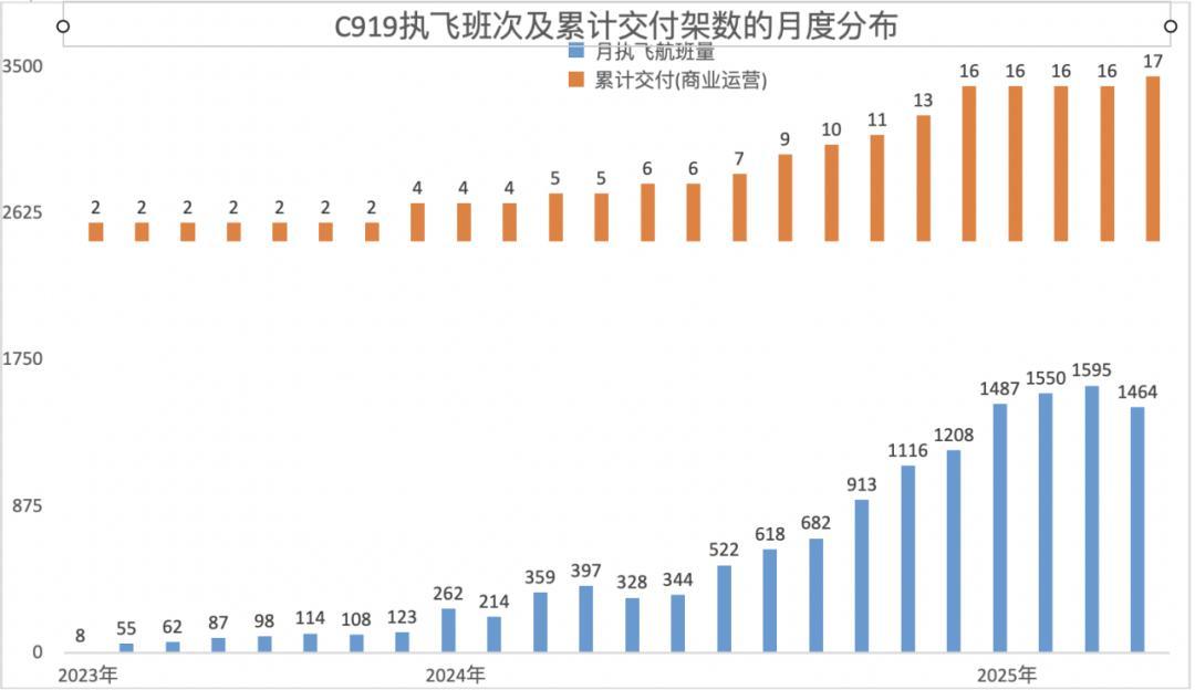 C919的规模化运营正在提速,月度执飞航班量呈现逐月增长的趋势,据航班管家统计,4月单月执飞近1500班次,尽管因淡季导致环比有所回落,但是同比仍然增长268.8%。