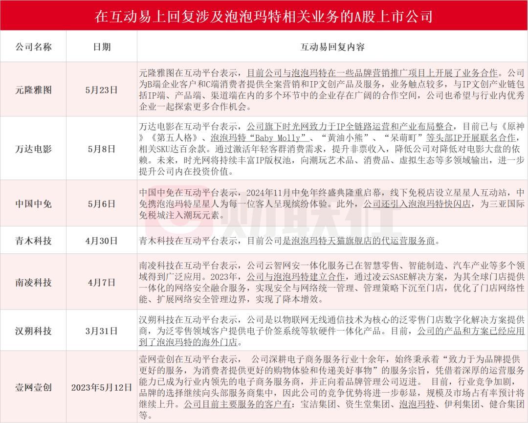 作为潮玩行业的龙头企业,泡泡玛特虽然登陆港股,但其身后隐藏着一张紧密的A股“朋友圈”。据财联社不完全整理,元隆雅图、万达电影、中国中免、青木科技、南凌科技、汉朔科技和壹网壹创在互动易上回复涉及泡泡玛特相关业务。元隆雅图5月23日在互动平台表示,目前公司与泡泡玛特在一些品牌营销推广项目上开展了业务合作。万达电影5月8日在互动平台表示,公司旗下时光网致力于IP全链路运营和产业布局整合,目前已与泡泡玛特“Baby Molly”等头部IP开展联名合作。具体情况如下: