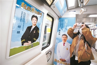 当日启动仪式现场,劳模代表们纷纷走进车厢与自己的专属海报“同框”。步入车厢,国网北京电力城市照明管理中心华灯班班长、延庆区文物管理所所长于海宽等劳模、先进工作者的海报扑面而来,他们坚毅的目光、温暖的笑容与岗位寄语相得益彰。扫描海报下方的二维码,进入“北京劳动者之歌”专栏,里面翔实的文字还能为乘客解锁更多劳模背后的奋斗故事。