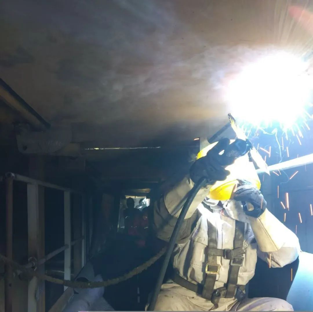 魏钧还特别提到了两个数字,1平方米和100度。“它的箱体很大,里边就跟蜂巢一样小格一小格的小箱体。我们要钻到小箱体里去焊,最大空间也就不到一米见方,对面温度有100多度,热气逼人。专门采购了冷风机,在人和钢板之间形成一个冷气屏障,要不然根本没办法施工。”