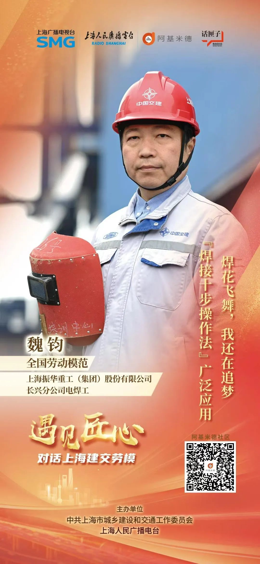 手握焊枪,火光耀眼。屏气凝神间,一道道焊缝完美形成,一个个构件坚固牢靠!今天的“遇见匠心——对话上海建交劳模”,对话全国劳动模范、上海振华重工(集团)股份有限公司长兴分公司电焊工魏钧。