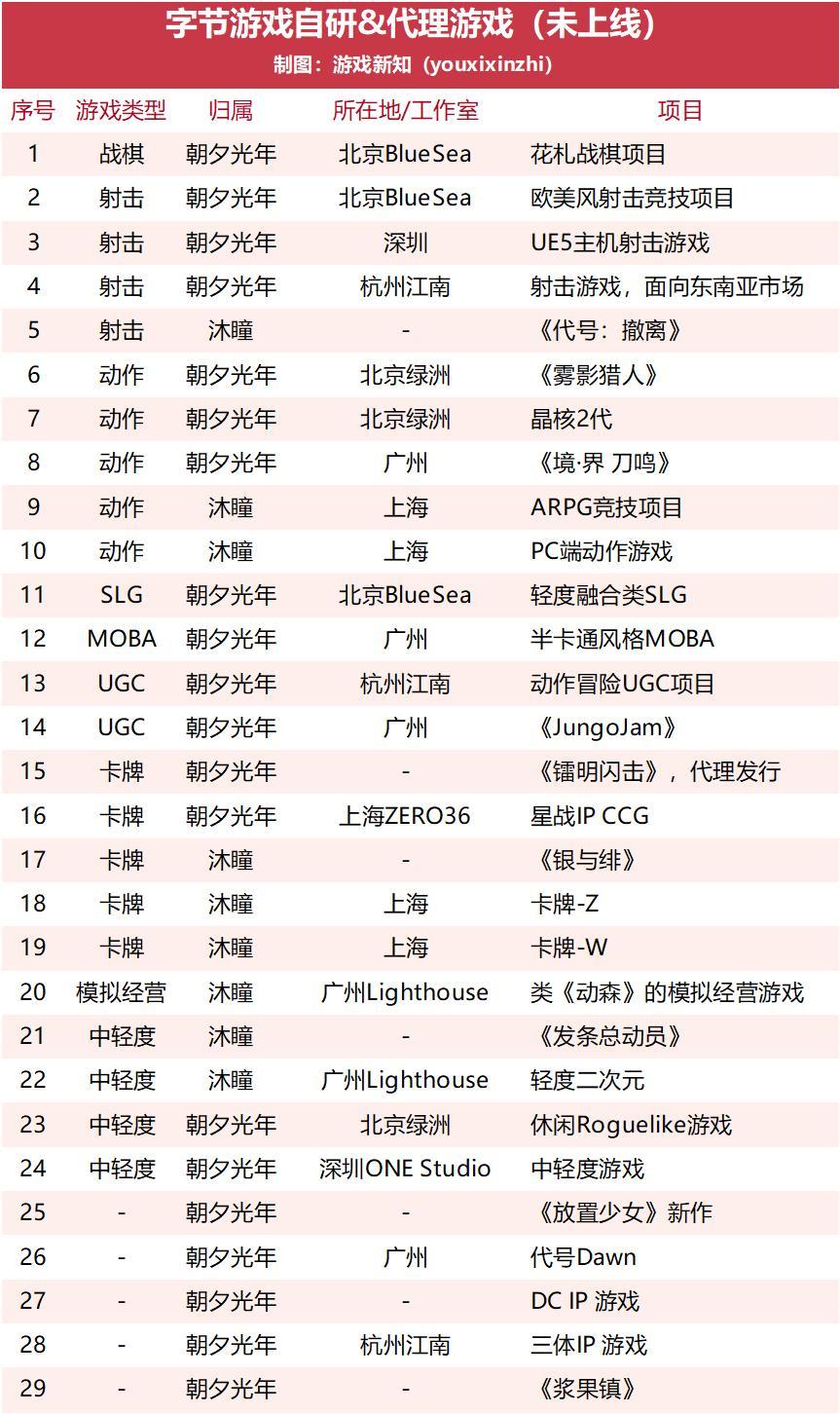 据公开信息和访谈了解,字节游戏旗下包括已上线产品已经有40款,其中在研的未上线的也有近30款。在研项目类型覆盖了卡牌、战棋、SLG、射击、ARPG等品类,其中有部分项目已经透露了一些公开信息。