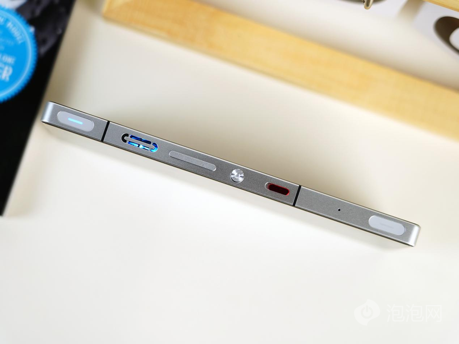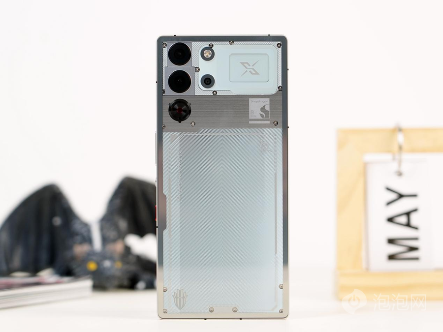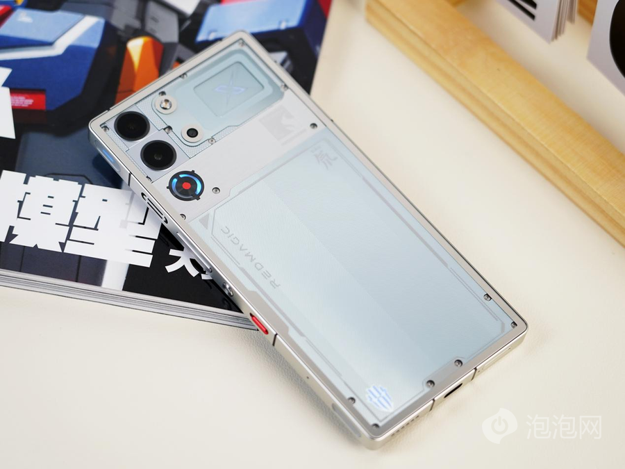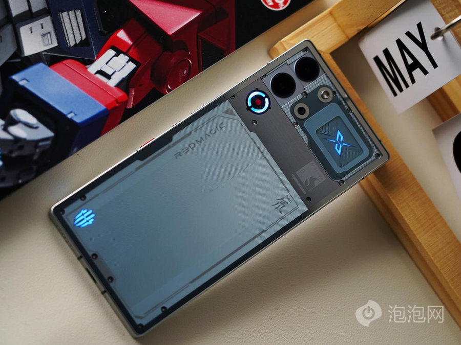 我们这台为氘锋透明银翼配色,在机身右上方有一个“X”标识,细看之下可以发现这个“X”实际上是由“S”组成,代表了红魔10S Pro系列的无限可能。这个标识也是手机的氛围灯,支持RGB灯效,让手机的电竞氛围拉满。