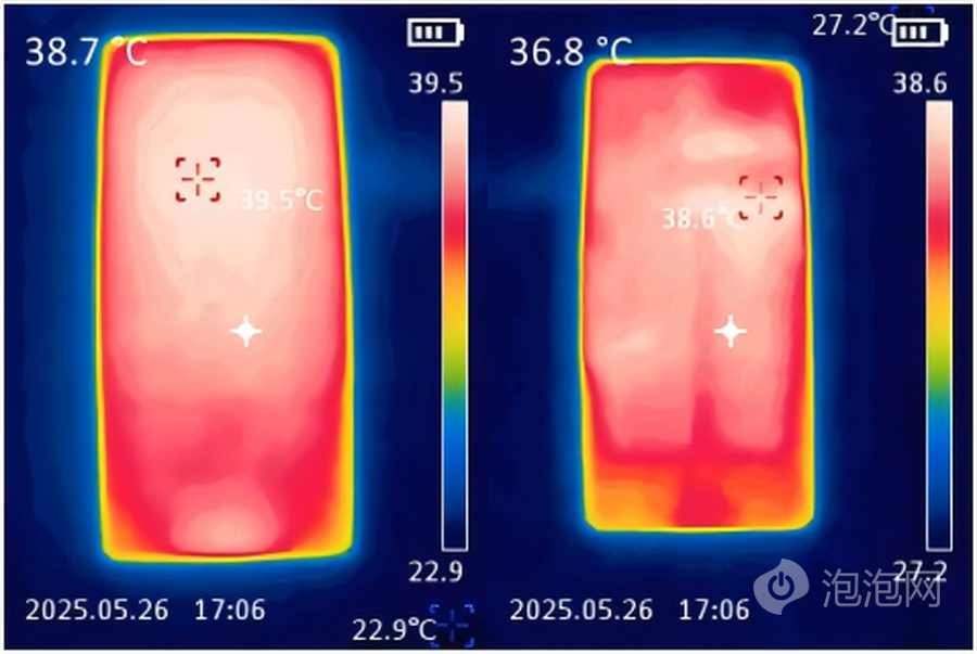 红魔10S Pro不仅配备了驭风3.0风扇散热,还采用了三明治结构2.0,采用高导热合金材质,具备更高效热传导,经过实测,在30分钟《原神》之后,机身正面温度为39.5℃,背部温度为38.6℃,在游戏过程中对温度的控制十分能出色。